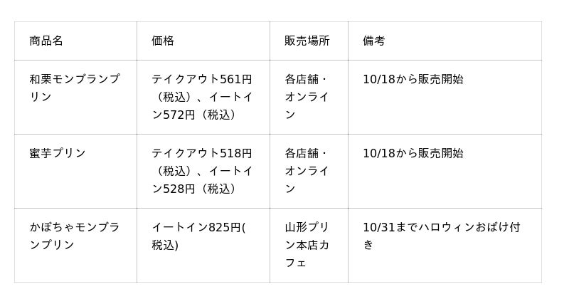 販売店舗:山形プリン本店(上山市)、山形プリン道の駅蔵王、オンラインストア(※かぼちゃモンブランプリンは本店カフェ限定)