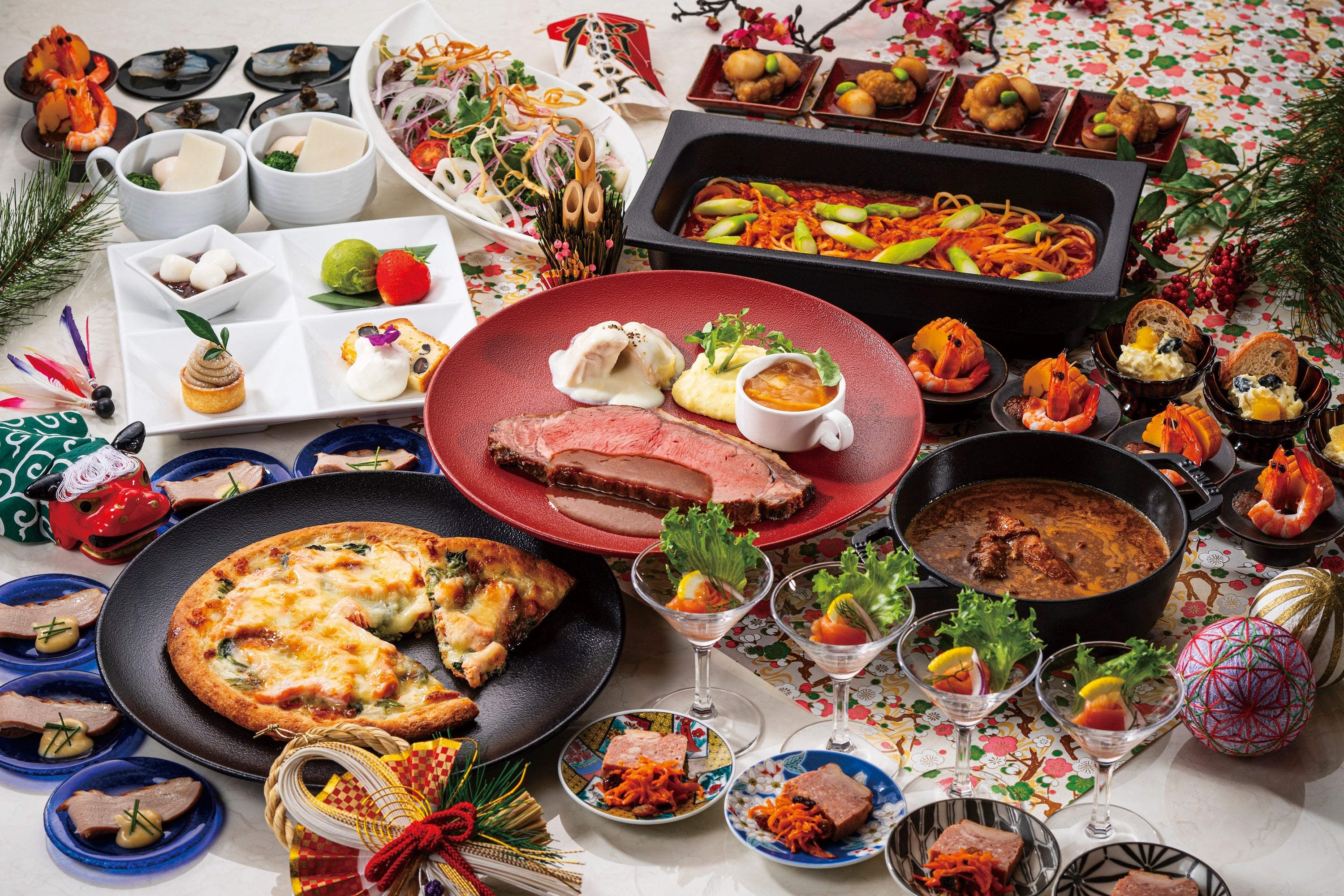 お正月らしいお料理も取りそろえたタパスカクテル、サラダにパスタ、お子様が喜ぶピザだけでなく洋風のお雑煮やカレーも食べ放題です。新年を祝うメイン料理として3種の肉料理の盛合せを用意するほか、和風スイーツなど4品を盛り合せたデザートをお席へお届けします。また、1月3日(土)と4日(日)の2日間限定イベントとして、各テーブルにマジシャンが伺い、目の前でテーブルマジックを披露。新春を祝うお料理とともに思い出に残るひとときを演出します。