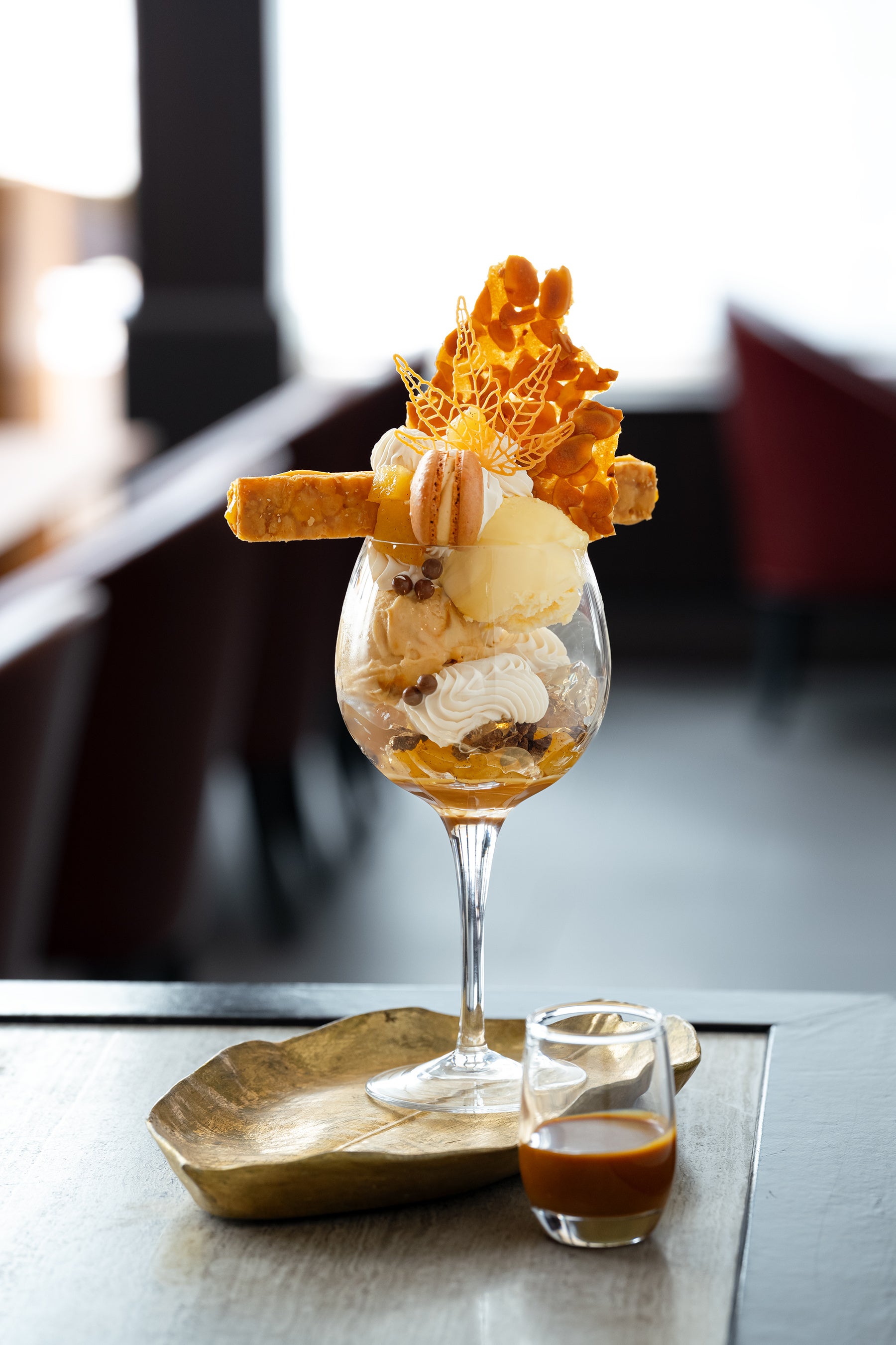 トップには、香ばしいナッツが香るフロランタンヌガー、秋の彩りを象った紅葉型パニエ、そして軽く繊細な歯ざわりのミルフィールキャラメルオランジェをあしらい、見た目にも華やかな秋の情景を演出します。グラスの中には、洋梨のキャラメルコンポートをはじめ、キャラメルと洋梨を合わせたジェラートや、柑橘類の一種クレメンティンを使ったジェラート、メープルクリーム、ジェノワーズショコラなど、味わいと質感の異なる層が10種類以上も重なり、ひと口ごとに広がる多彩な味わいをご堪能いただけます。