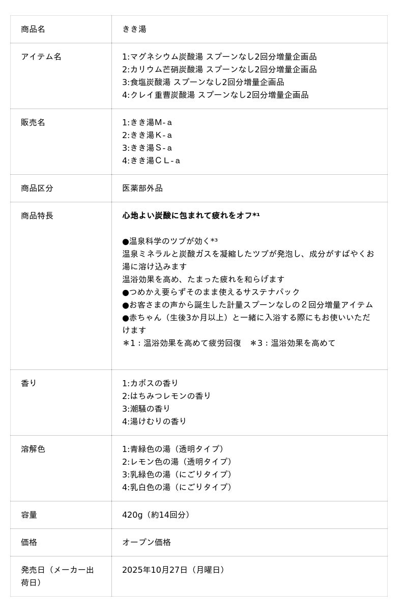 株式会社バスクリン(本社:東京都千代田区 社長:三枚堂正悟)は、心地よい炭酸に包まれてたまった疲れをオフ*¹する入浴剤「きき湯」ブランドより、「マグネシウム炭酸湯」「カリウム芒硝炭酸湯」「食塩炭酸湯」「クレイ重曹炭酸湯」の4アイテムにて、付属の計量スプーンをなくし、2回分増量した企画品を10月27日(月曜日)より数量限定で発売いたします。お客さまの声をきっかけに誕生した、特別な仕様です。