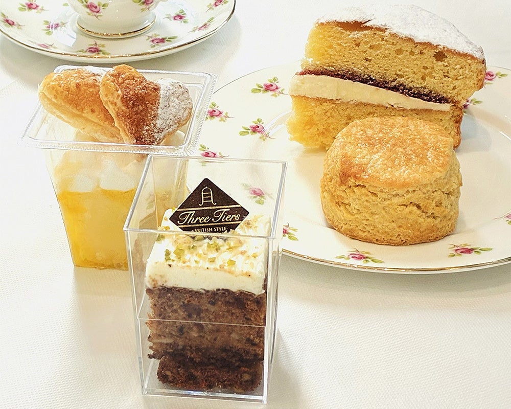 〈スリーティアーズ〉トリプルバタースコーン、ヴィクトリア・サンドイッチ、レモンクリームパイ、キャロットケーキ
