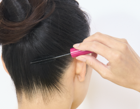 ブラシをもみあげの下に入れて根元から毛先に向かってスライドさせます。