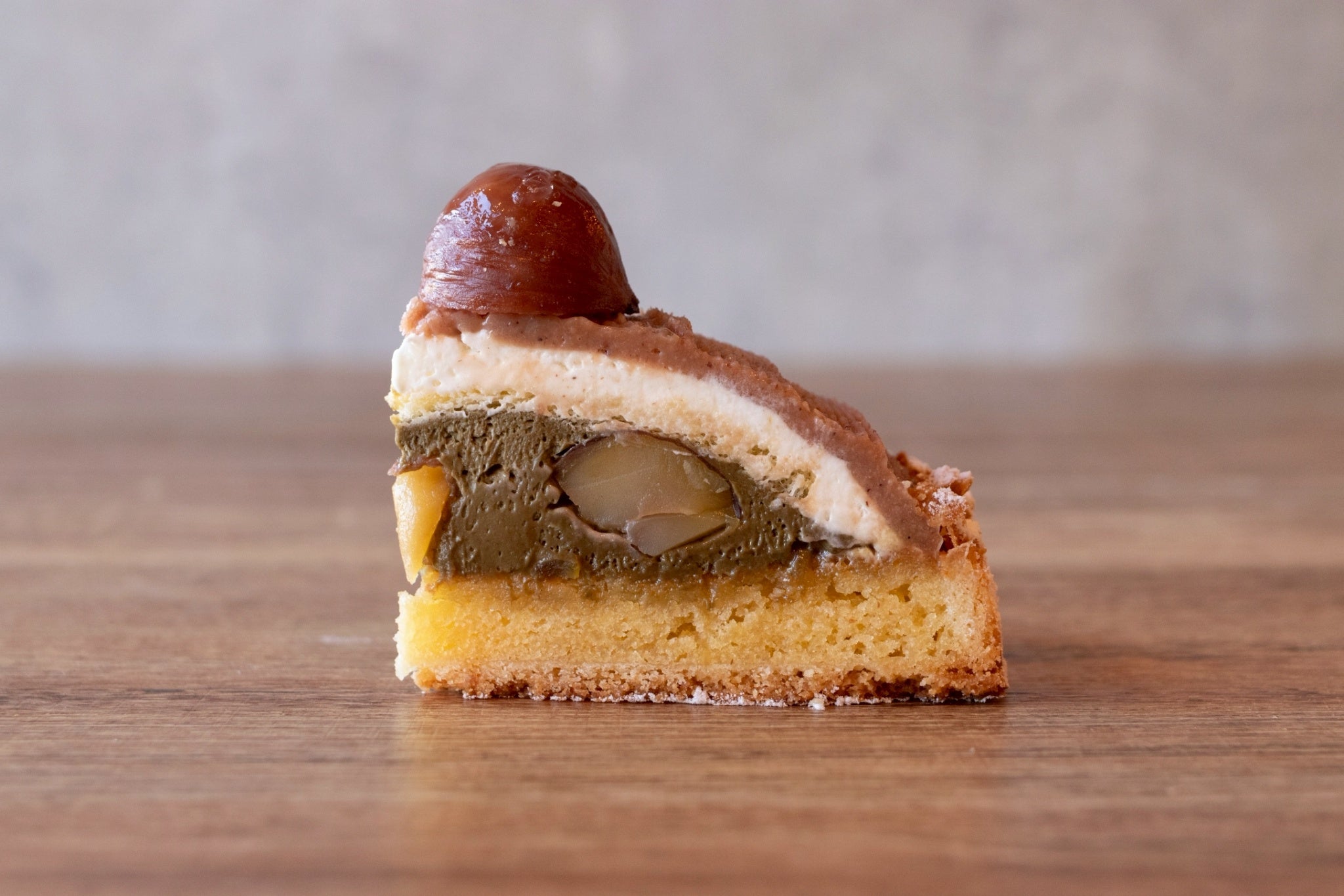 香ばしいアーモンドタルトに、栗を混ぜ込んだほうじ茶クリームをたっぷりと乗せた和のタルト。
