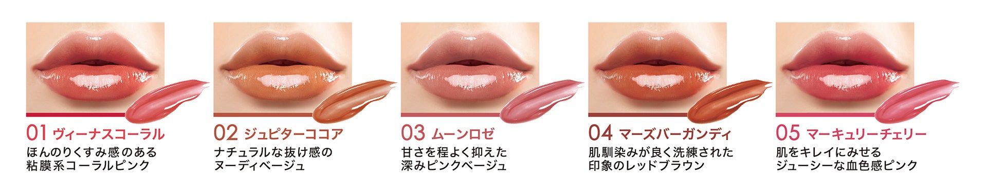 リップガーディアン グロウラッピングティント<リップカラー>左から01 ヴィーナスコーラル、02 ジュピターココア、03 ムーンロゼ、 04 マーズバーガンディ、05 マーキュリーチェリー