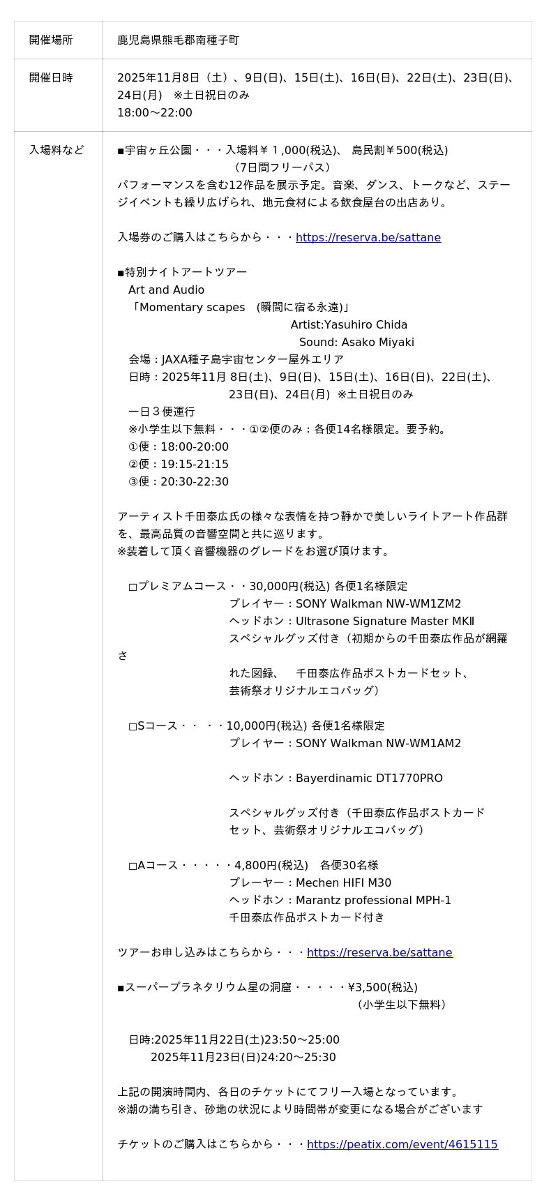 ![[11月8日~24日開催] 種子島宇宙芸術祭2025-世界各国で活躍する参加アーティストを一挙紹介!総勢22組31作品を展示予定!新しいスタイルの鑑賞ツアー「Art and Audio」も開催決定!](https://prtimes.jp/img/126913/16/resize/d126913-16-78fecc687e4da4b50aa4-27.jpg)