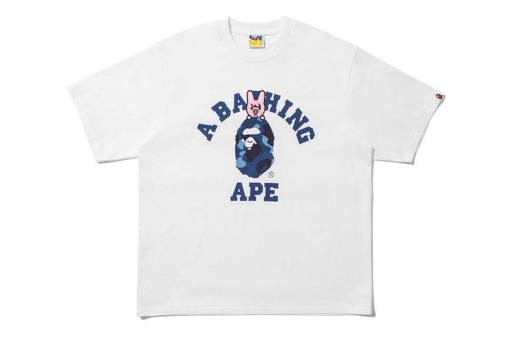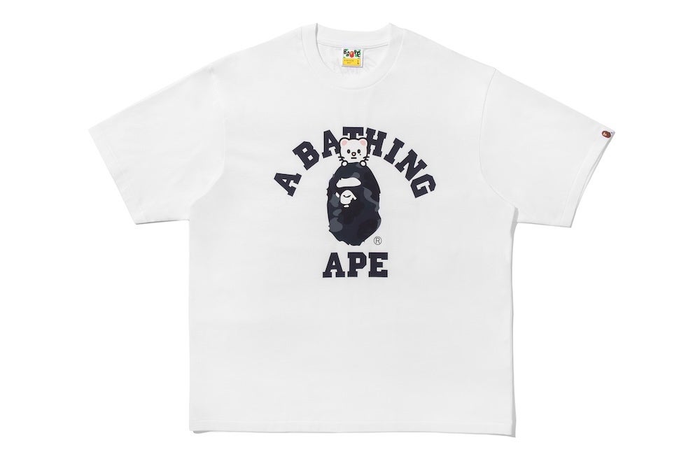 カレッジTシャツには、メンバー自身がセレクトしたカモフラ柄をあしらい、スタイルを完成。オリジナルのSKZOOキャラクターは、BAPE(R)ならではのグラフィックで描かれ、APE HEADロゴの上にポップに顔をのぞかせています。