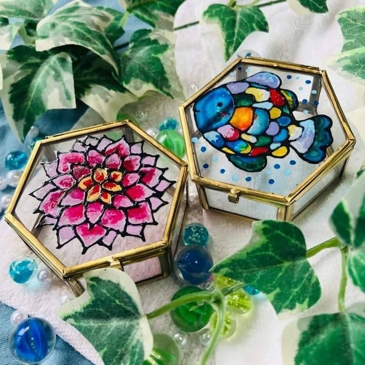 川崎市を拠点にアクセサリー雑貨を制作している「あそびのわとわ」によるディンプルアート体験。自動車のフロントガラスの樹脂を再利用して作られたサステナブルな絵の具「ディンプルアート」を使用した、ステンドグラス風のアート雑貨を作ります
