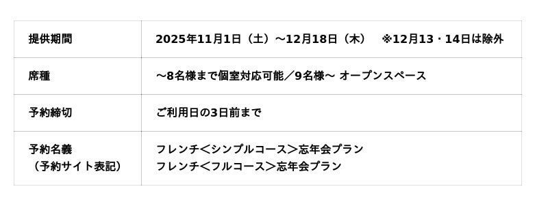 株式会社スティルアン(本社:静岡県浜松市)は、レストランで“きちんと”愉しめる**「フレンチコース忘年会プラン」を2025年11月1日(土)~12月18日(木)まで(※12月13・14日を除く)提供します。~8名様までは個室対応可能/9名様以上はオープンスペースでのご案内、予約受付期限はご利用日の3日前となっています。コースとペアリングは2種から選べ、会食の目的やご予算に合わせて最適な組み合わせをお選びいただけます。