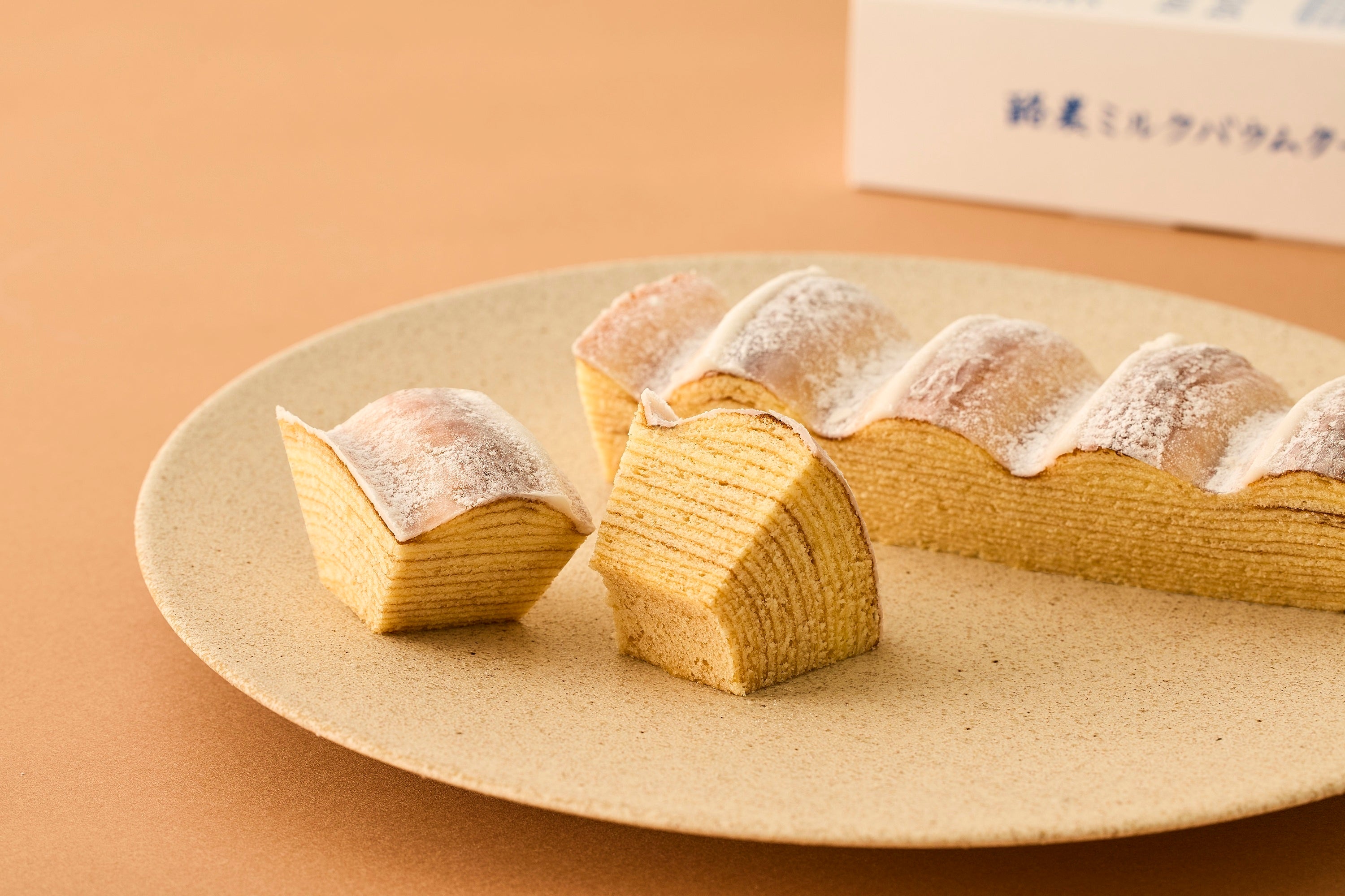北海道の自社牧場で搾った放牧牛乳や平飼い卵を使い、ふんわり厚みのある層に焼き上げました。外側のしっとりとしたミルクのグラスと溶け合い、やさしい甘みとコクが広がります。自然素材にこだわった、酪農の恵みを感じるバウムクーヘンです。