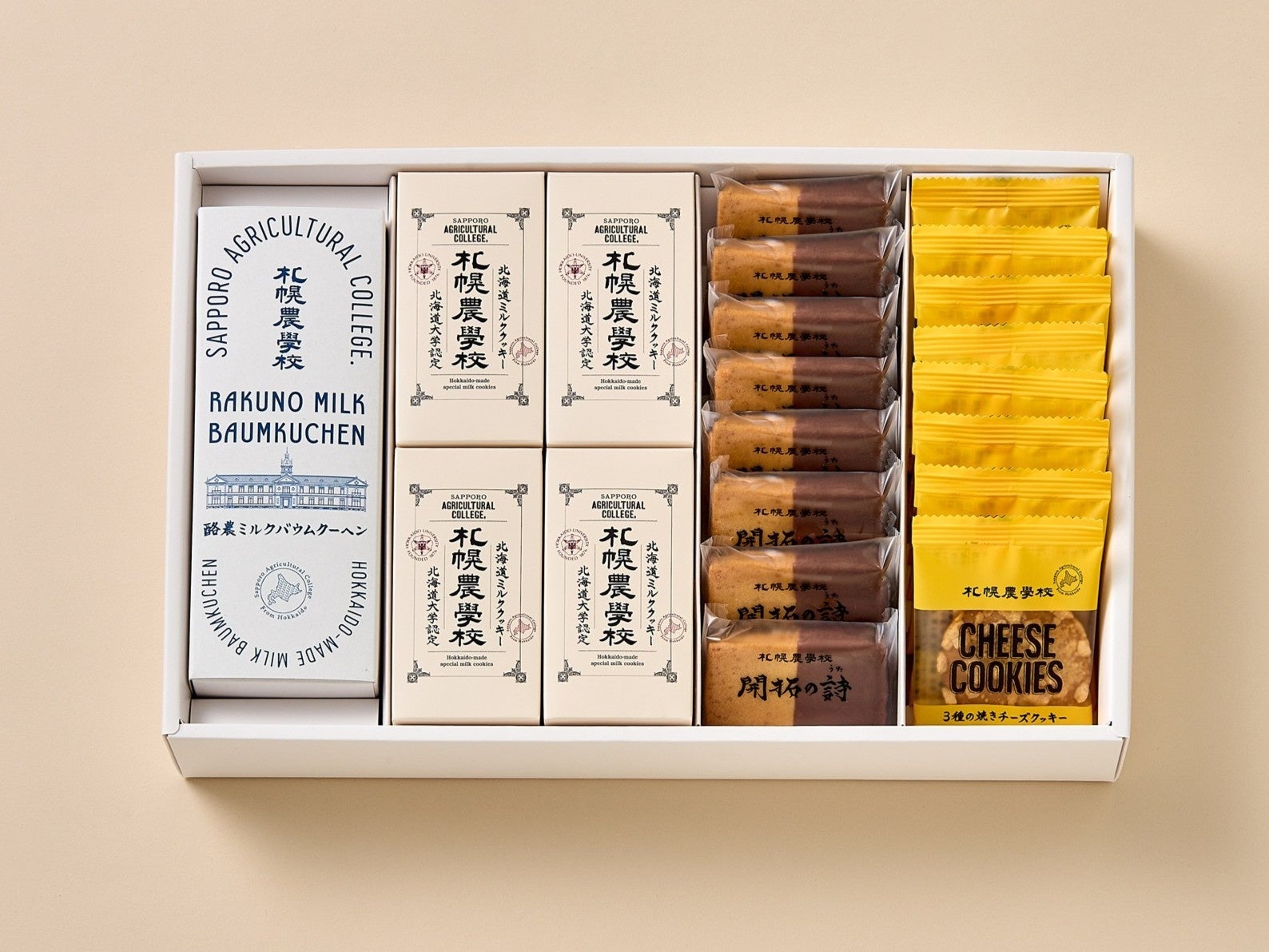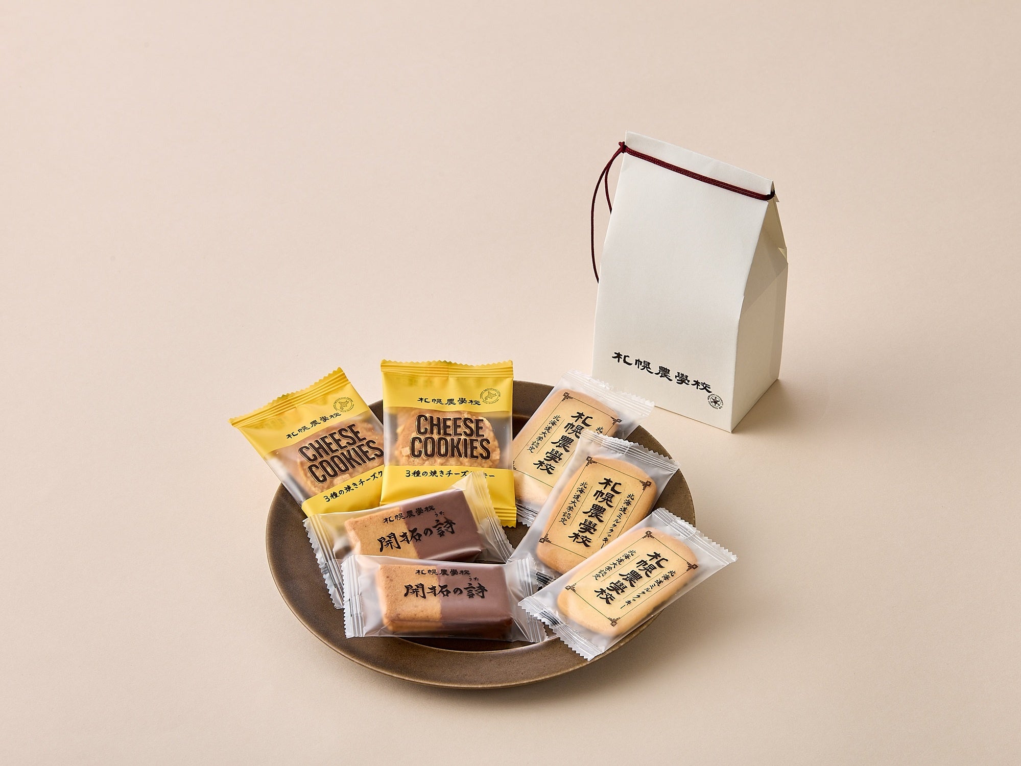 手土産や、お手渡しギフトに最適な、札幌農学校の代表商品「北海道ミルククッキー」をはじめとした定番お菓子の詰合せです。ご家族や友人とのティータイム、手土産、季節のご挨拶に。
