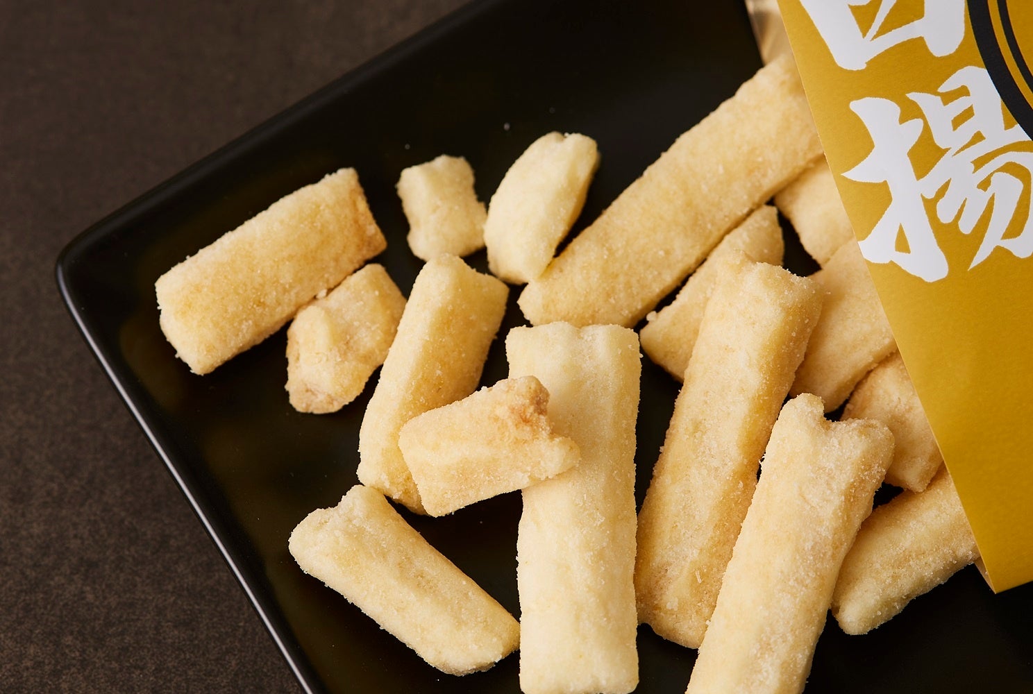 北海道産の特別栽培米を100%使用した餅に、チーズをそのまま練りこみ、サクッと揚げました。マイルドでコクのあるチーズパウダーをたっぷりとかけ、白い揚げ餅に仕上げました。チーズパウダーの塩味、中に隠れたチーズの香ばしさが魅力のおかきです。