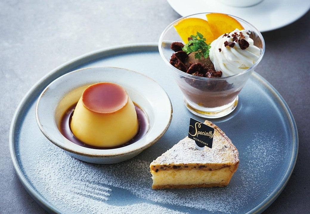 ラムレーズン&バターのチーズケーキ、カスタードプリン(ミニ)、ベルギー産チョコレートアイスクリームで仕立てたミニパフェを盛り合わせました。ラム酒香るオレンジコンポートとチョコレートクッキーが味と食感を引き立てます。