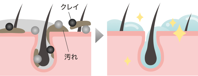オイルが汚れを浮かし、クレイ*8が吸着。細かいスクラブ*9が不要な角質も除去します。頭皮や髪のダメージは最小限にしつつ、しっかり洗浄。