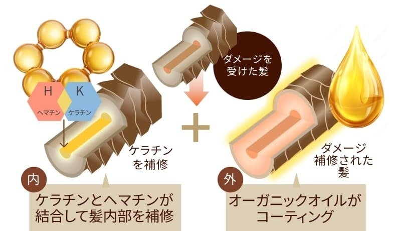 髪の主成分であるケラチン*4や、ケラチンと結合力の強い補修成分ヘマチン*5を配合。ダメージホールに入り込み、しっかり補修します。