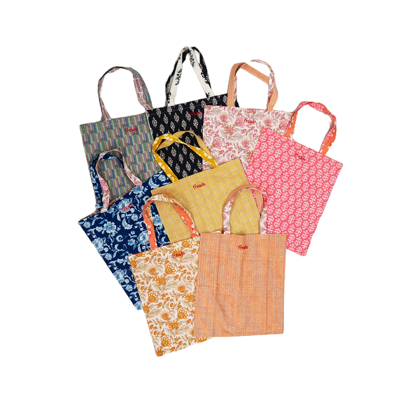 Freadaのアイテムが生産されているインドの縫製工場で出たブロックプリントの残布を使ったトートバッグを、ご購入の方にプレゼント!