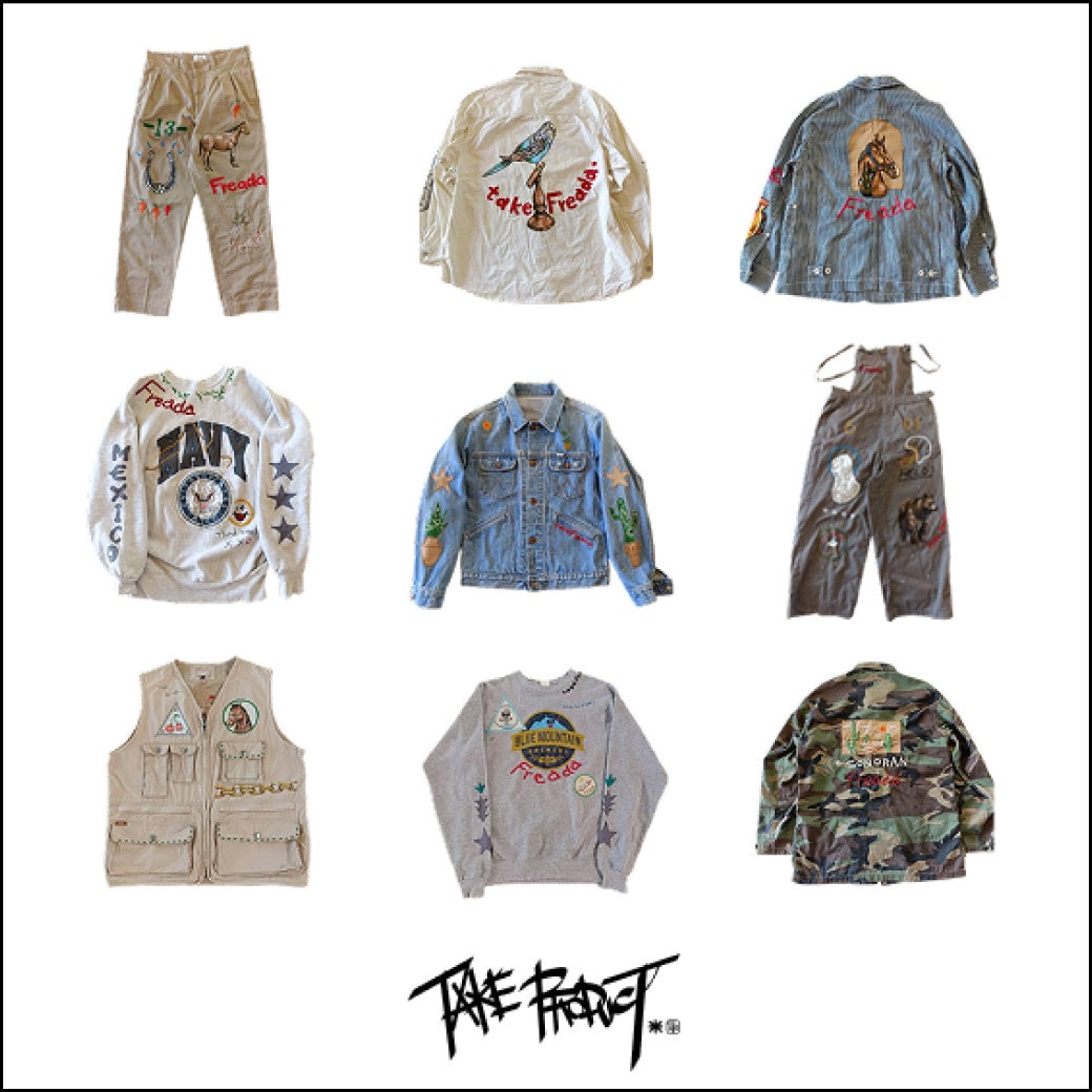 「生活から民芸、ときどきPUNK」をテーマに活動する「Take Product」竹内氏とFreadaによる共同企画 #TakeFreadaは、古着に手刺繍を加え、一点ものとして新たな価値を生み出すプロジェクト。オンライン販売は行わず、対面での手売りにこだわる姿勢も魅力のひとつ。今回は、10月中旬にFREAK'S STORE京都で初披露された、ペイントと刺繍を組み合わせた新作が登場。