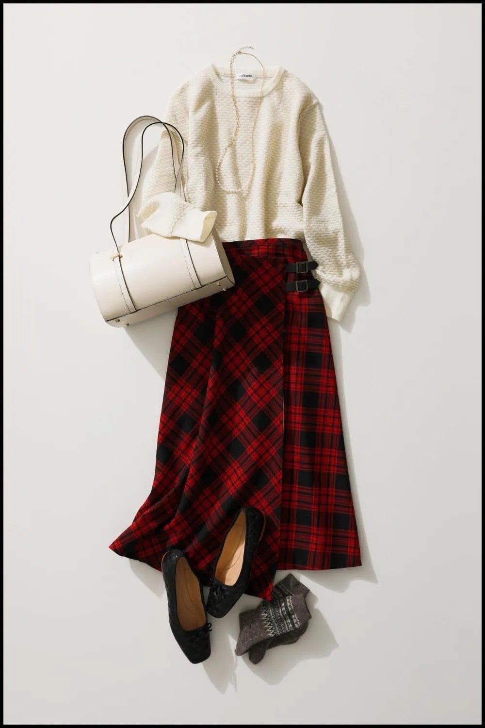 軽やかなニットを合わせれば、チェックがやさしい表情に。ホワイトバッグで抜け感を加えました。フェミニンさと親しみやすさを両立した、デイリーにおすすめのスタイルです。
