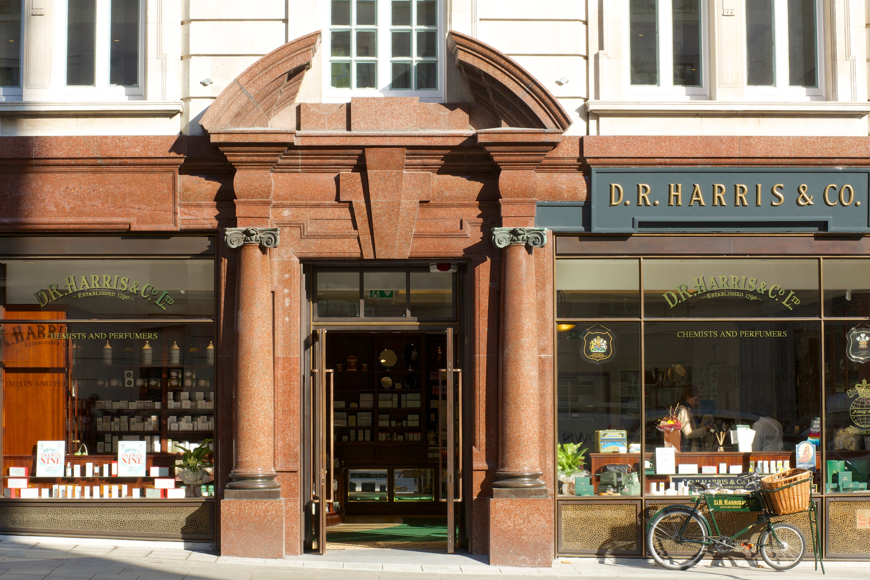 セント・ジェームズ29番地にあるロンドン最古の薬局、1790年創業の「D.R.HARRIS(ディー・アール・ハリス)」。長年男女問わず、英国人に愛用されてきたオーデ・コロンやアフターシェーブ、石けん、シャンプーなどの香り高い化粧品は、その質の高さに加え、気品とノスタルジーを感じさせるデザインも含めて人気が高いブランドです。