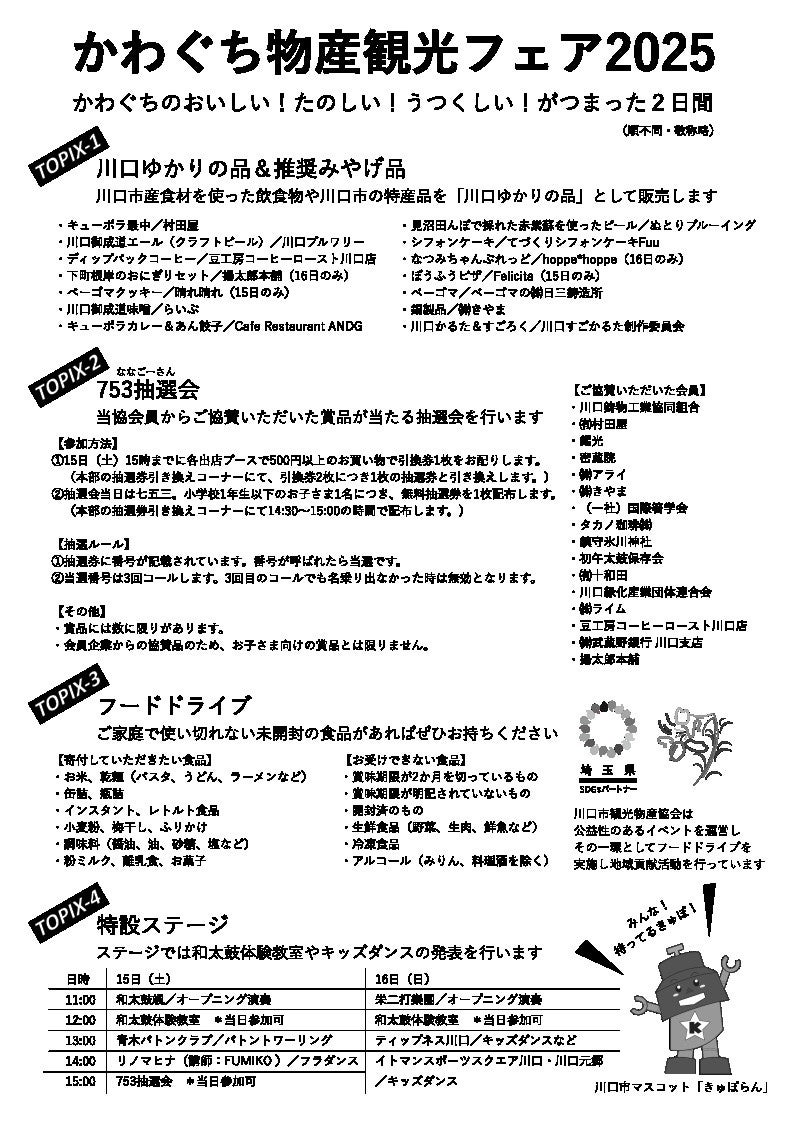 特定非営利活動法人フードバンク埼玉は、令和7年11月15日(土)・16日(日)に開催される「かわぐち物産観光フェア 2025」の会場内でフードドライブ(食品の回収)を実施します。