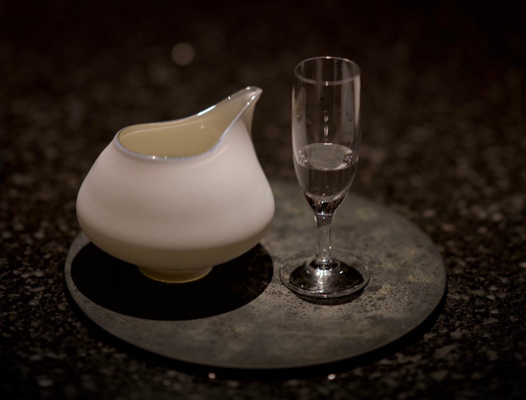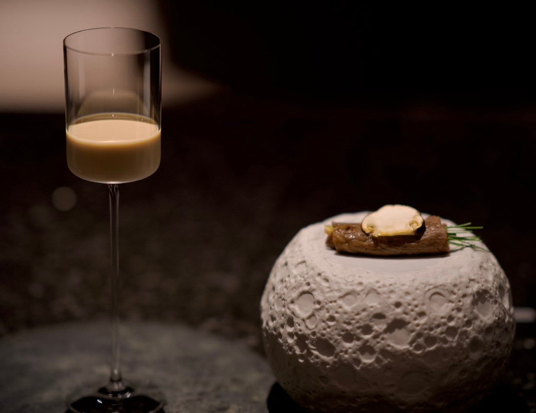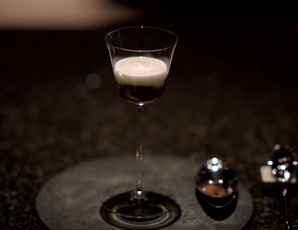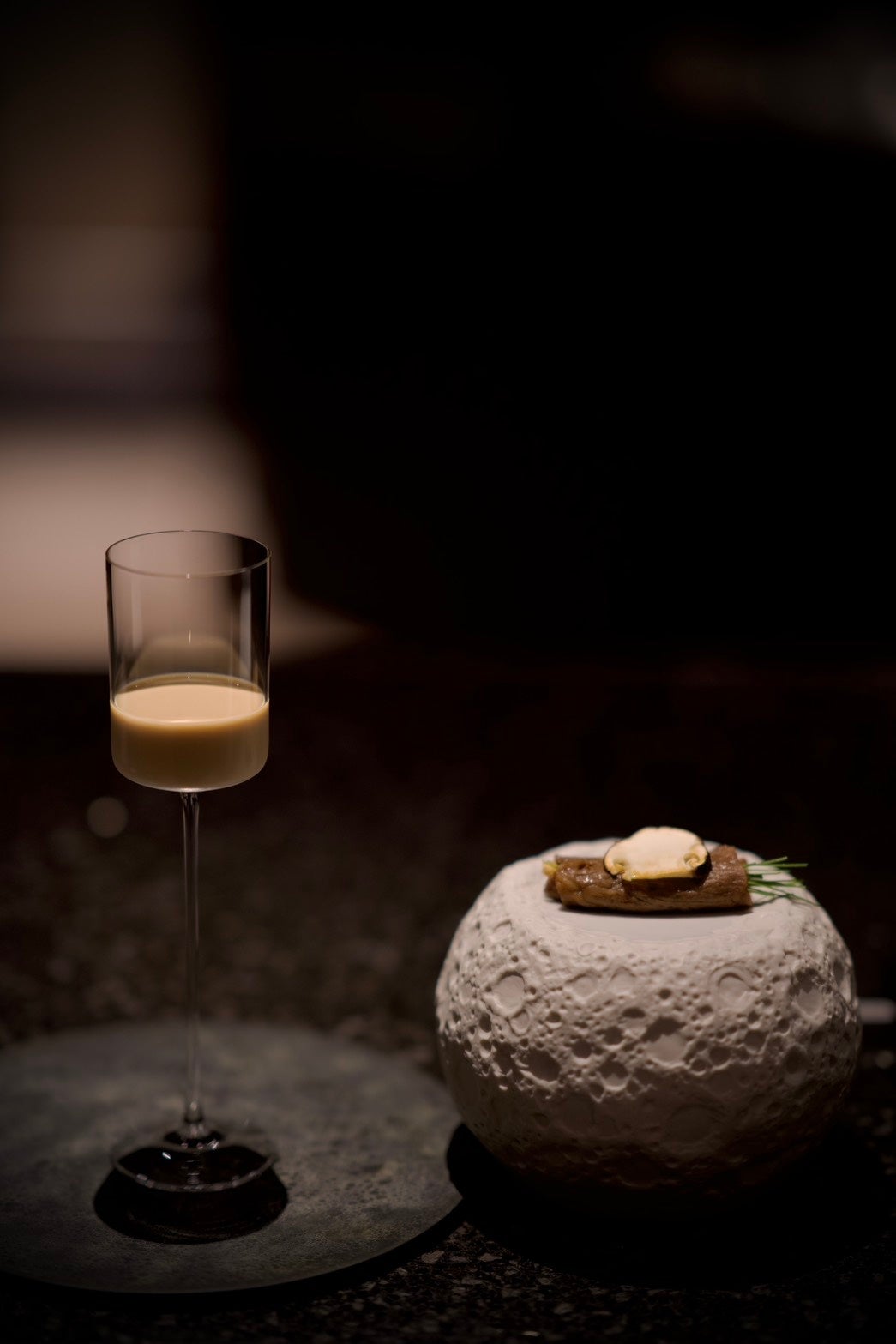 コロンビア「La Maria Geisha Natural」を、岡山ジャージーのミルクで抽出したミルクブリューに。神戸牛モモ肉、北海道産松茸、100年熟成のシェリーワイン「ペドロ・ヒメネス」を合わせます。コーヒーがもつレーズンのような香味と響き合います。