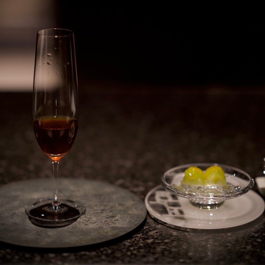 エチオピアのシダマ地域・ベンサの生産者、アルマス・グジョ・エルギソ氏によるナチュラルコーヒー「Almaz COE#26 74158 Natural」をサイフォンで抽出。合わせる一品は、岡山産シャインマスカット、弓削牧場のフロマージュフレ、生ハム。フルーツの甘味と酸味を引き立て合う「エンハンスメント(相乗)」のペアリングを。