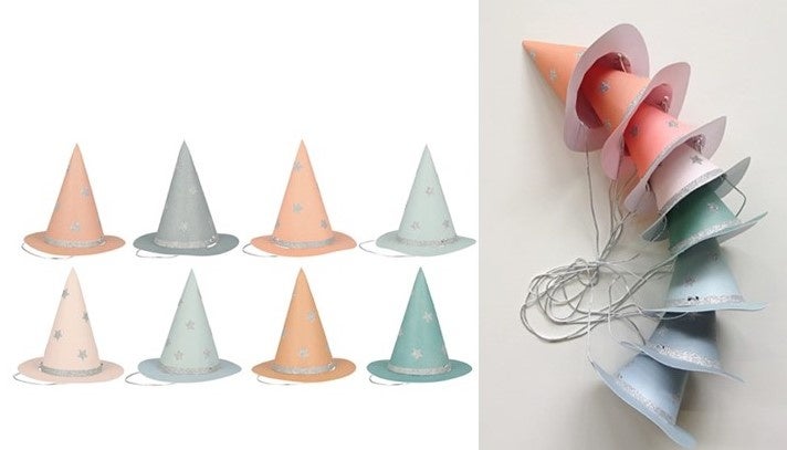 8個揃えればパステルのグラデーションが可愛い魔女の帽子です。星とリボンの部分がシルバーのラメになっており、ハロウィンパーティを盛り上げてくれる一品です。
