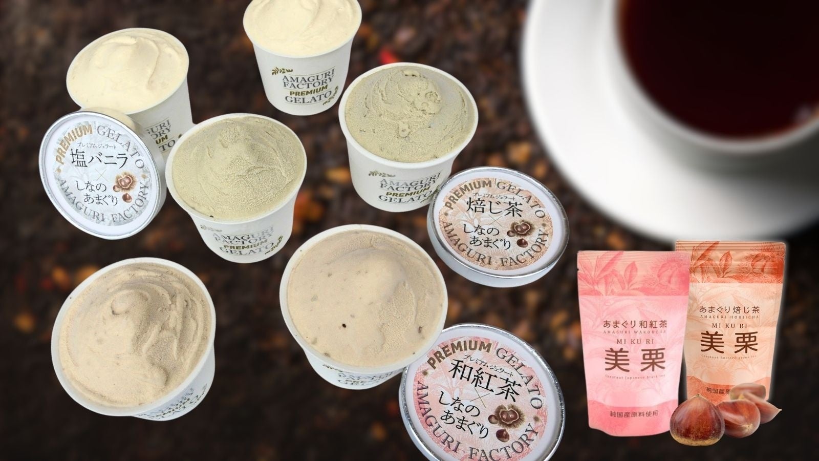 ジェラートの特別フレーバーにも使用されているのが、私たちが自社で開発した「あまぐり和紅茶 美栗」と「あまぐり焙じ茶 美栗」です。これらは、こだわりの茶葉に長野県宮田村で育った「しなのあまぐり」を独自にブレンドしたもの。お茶を淹れた瞬間にふんわりと栗の甘い香りが立ちのぼり、ひと口ごとにやさしい余韻を残します。ホットでもアイスでも、日常のひとときを少し贅沢にしてくれる、私たちの“もうひとつの代表作”であり、ジェラートに入れた時の相性も抜群です。