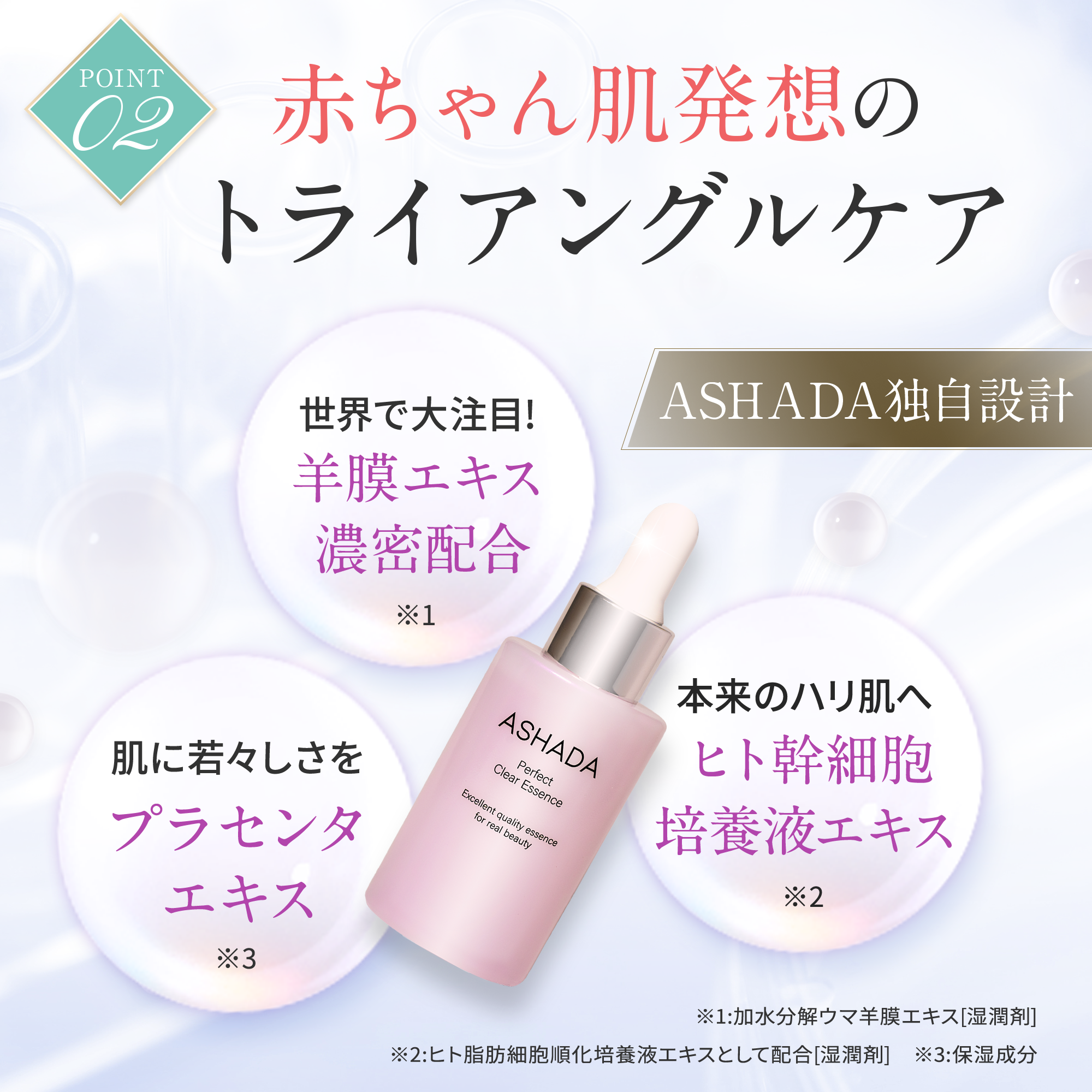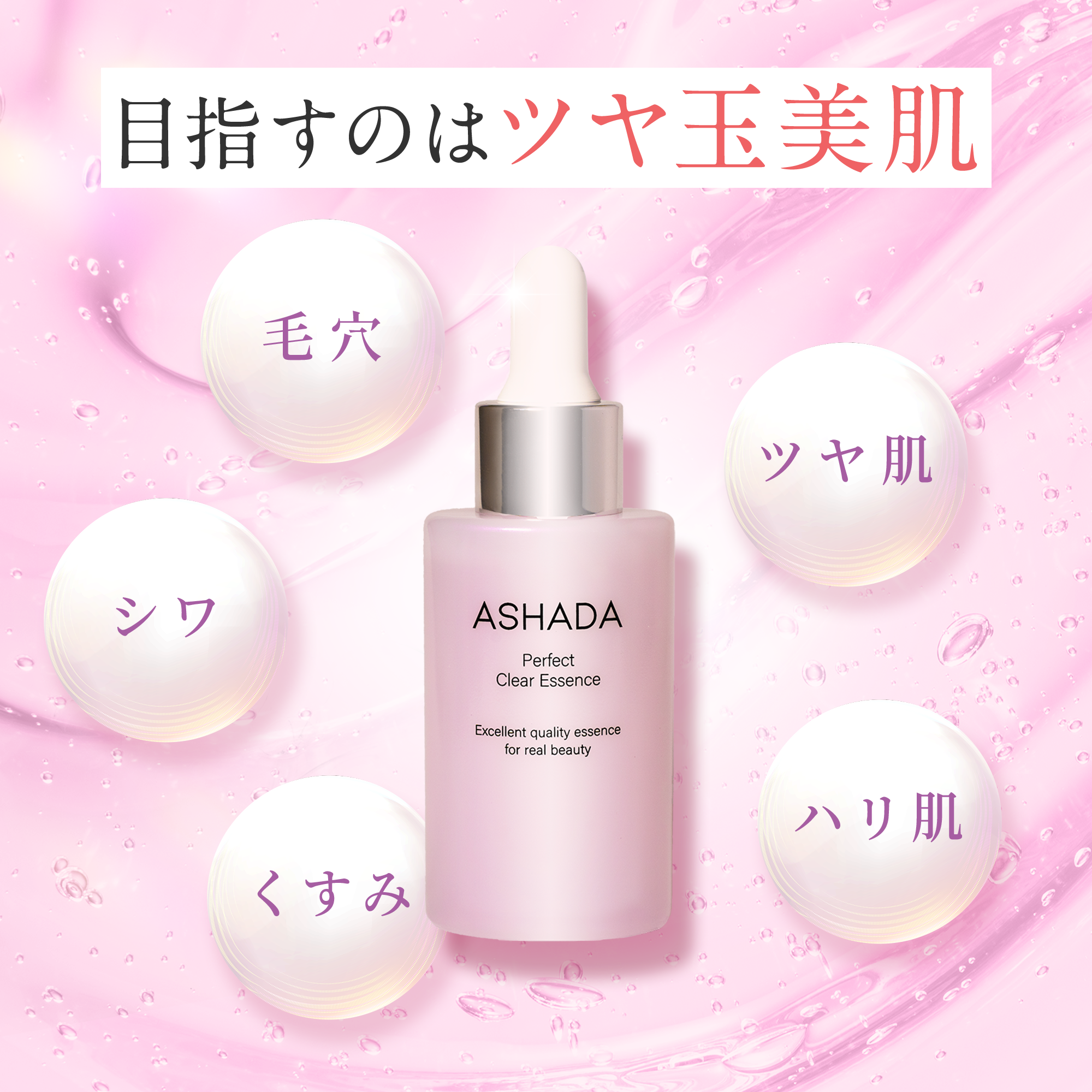 アスハダパーフェクトクリアエッセンスは、ヒト脂肪細胞順化培養液エキス、プラセンタエキス、ヒアルロン酸、ヒトオリゴペプチドの美容成分が豊富に含有されております。アルコール、パラベン、香料、鉱物油、合成着色料を使用しておりません。また大切なお客様に最高品質の商品をお届けするために、製造から出荷までの全行程を日本国内で行い、徹底した品質管理を行なっております。