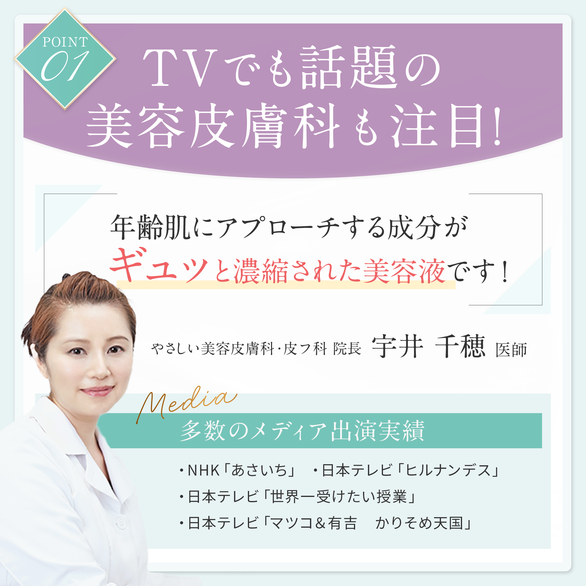 有効成分のナイアシンアミドとグリチルリチン酸ジカリウム配合で、シワ改善とシミ予防にWアプローチ。使うほどに潤い、ハリ・透明感のある肌へ導きます。更には美白※効果も。※メラニンの生成を抑え、シミ・ソバカスを防ぐ。