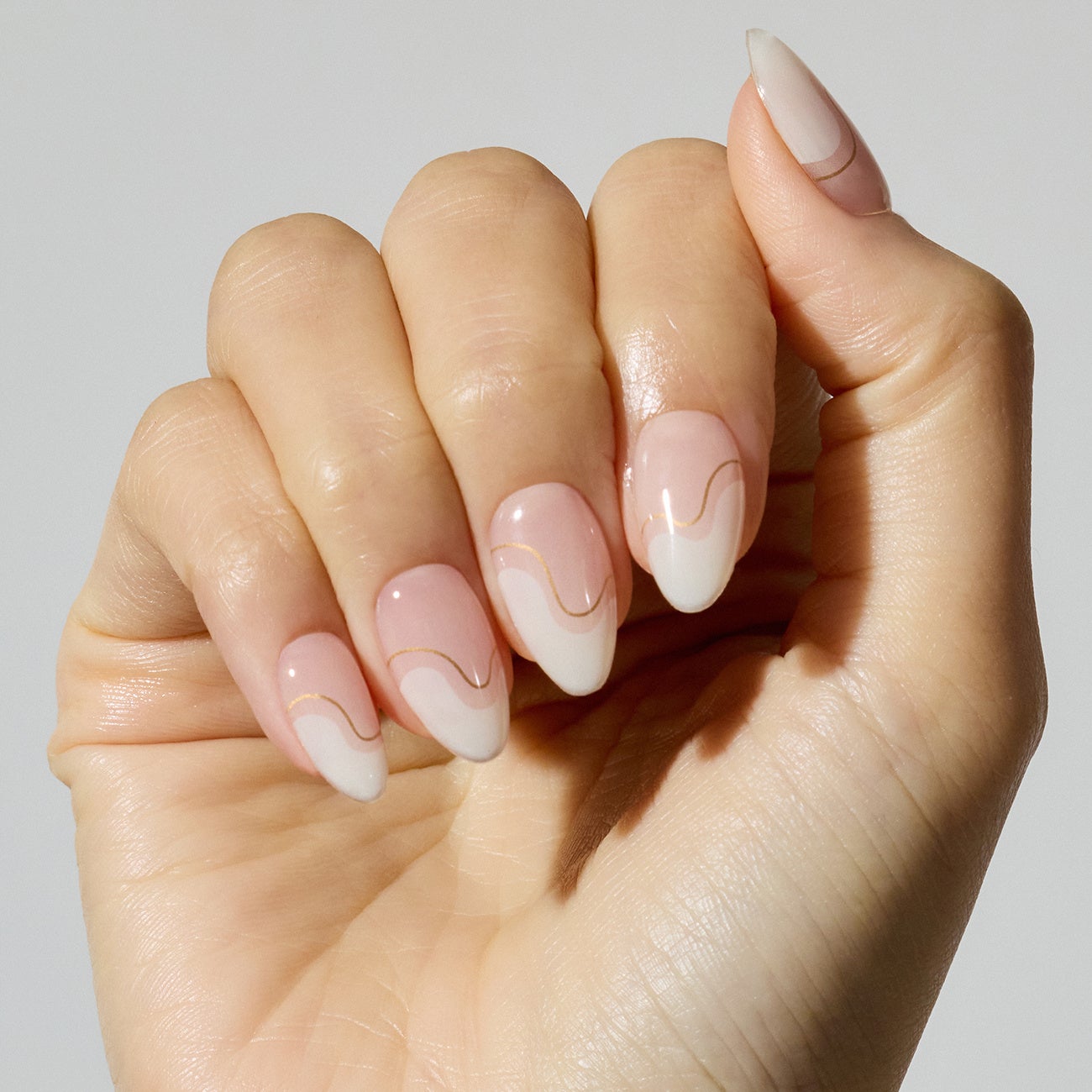 なめらかに波打つようなカーブを描くフレンチラインが魅力のデザイン。シンプルなホワイトフレンチに、ゴールドラインで感度の高いアクセントを加え、指先を洗練されたムードで包みます。