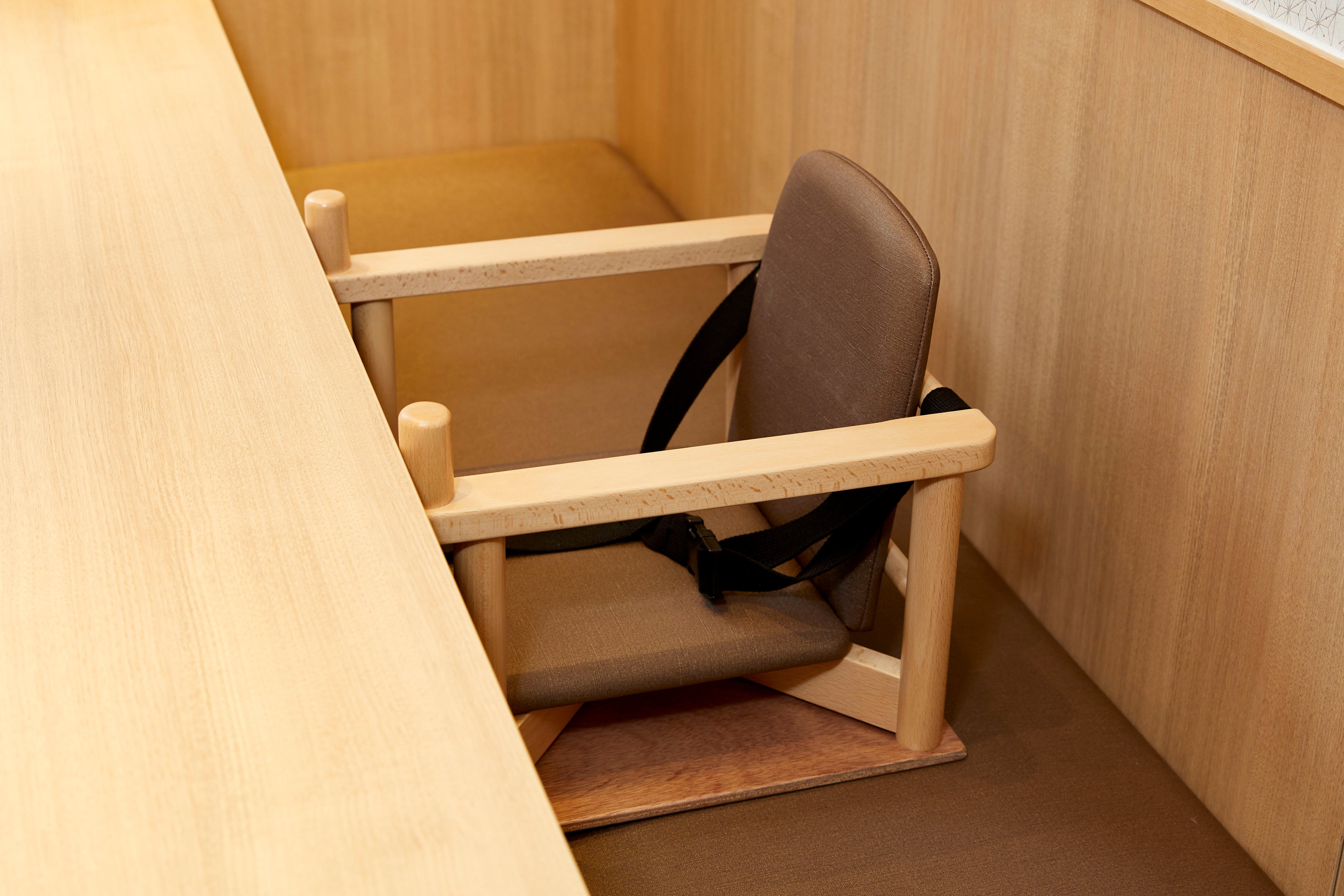 バリアフリーなレイアウトなので、車いすの方やベビーカーでもスロープ付きの玄関から店内の広い通路でお席、お手洗いなどスムーズに移動いただけます。また、フロア席にはベビーカーでそのまま着席できる可動椅子のお席や、お子様用のいすや食器、おむつ替え設備(お手洗い内)もご用意していますので安心してご利用いただけます。