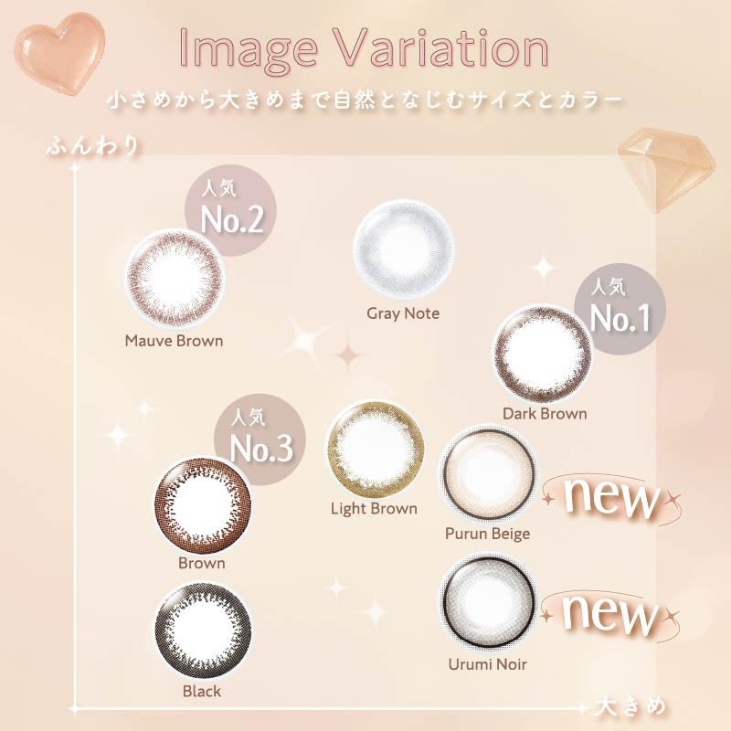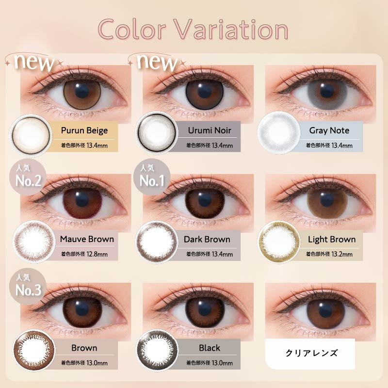 着色部外径:13.4mm(ぷるんベージュ・うるみノワール・グレーノート・ダークブラウン)、13.2mm(ライトブラウン)、13.0mm(ブラウン・ブラック)、12.8mm(モーヴブラウン)