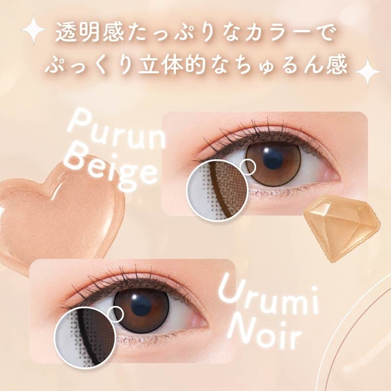 ぷるぷるでつや感たっぷりの儚げベージュ。光を宿す白みベージュと超極細フチでぷるんと透けるような瞳に。