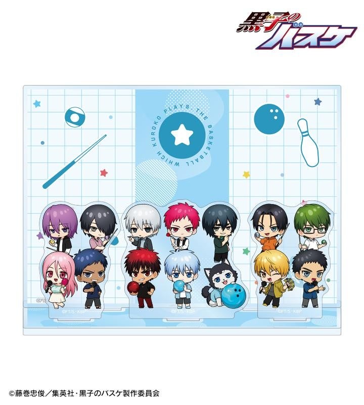 黒子テツヤ、火神大我、テツヤ2号、黄瀬涼太、笠松幸男、緑間真太郎、高尾和成、青峰大輝、桃井さつき、紫原 敦、氷室辰也、赤司征十郎、黛 千尋、花宮 真の描き起こしちびキャライラストをメインにデザインし、アクリルジオラマに仕上げました。