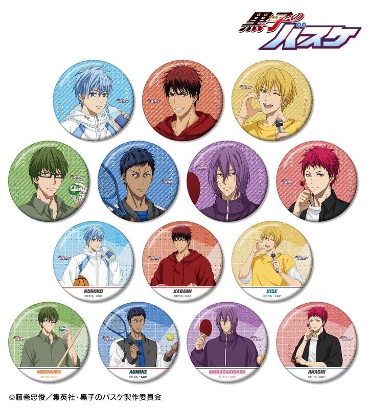黒子テツヤ、火神大我、テツヤ2号、黄瀬涼太、笠松幸男、緑間真太郎、高尾和成、青峰大輝、桃井さつき、紫原 敦、氷室辰也、赤司征十郎、黛 千尋、花宮 真の描き起こしちびキャライラストをメインにデザインし、ホログラム加工を施した缶バッジに仕上げました。