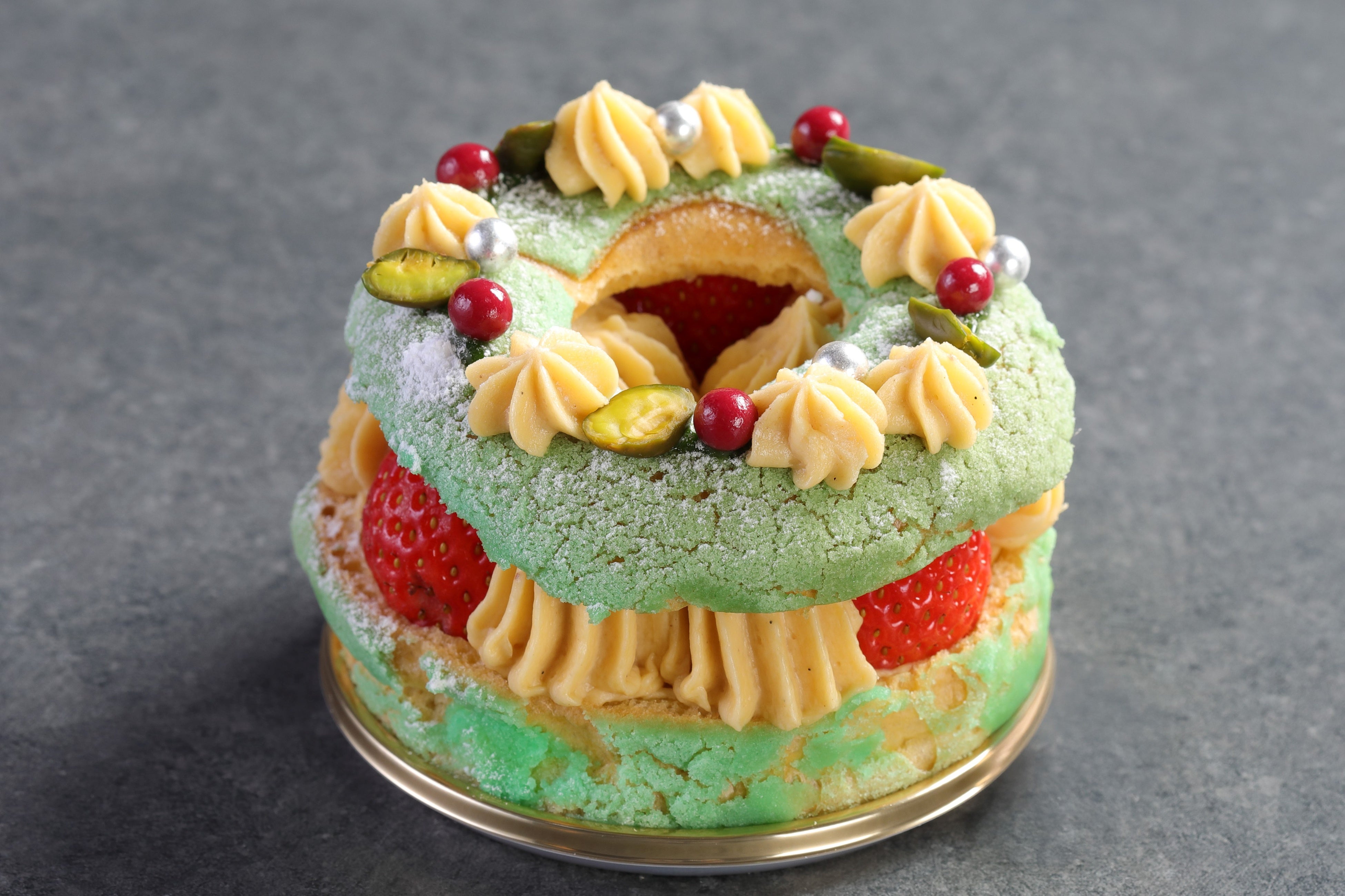 ヘーゼルナッツペーストを加えたカスタードクリームといちごをリング状のシュー生地でサンドし、オーナメントに見立てたフランボワーズチョコやピスタチオを飾りました。