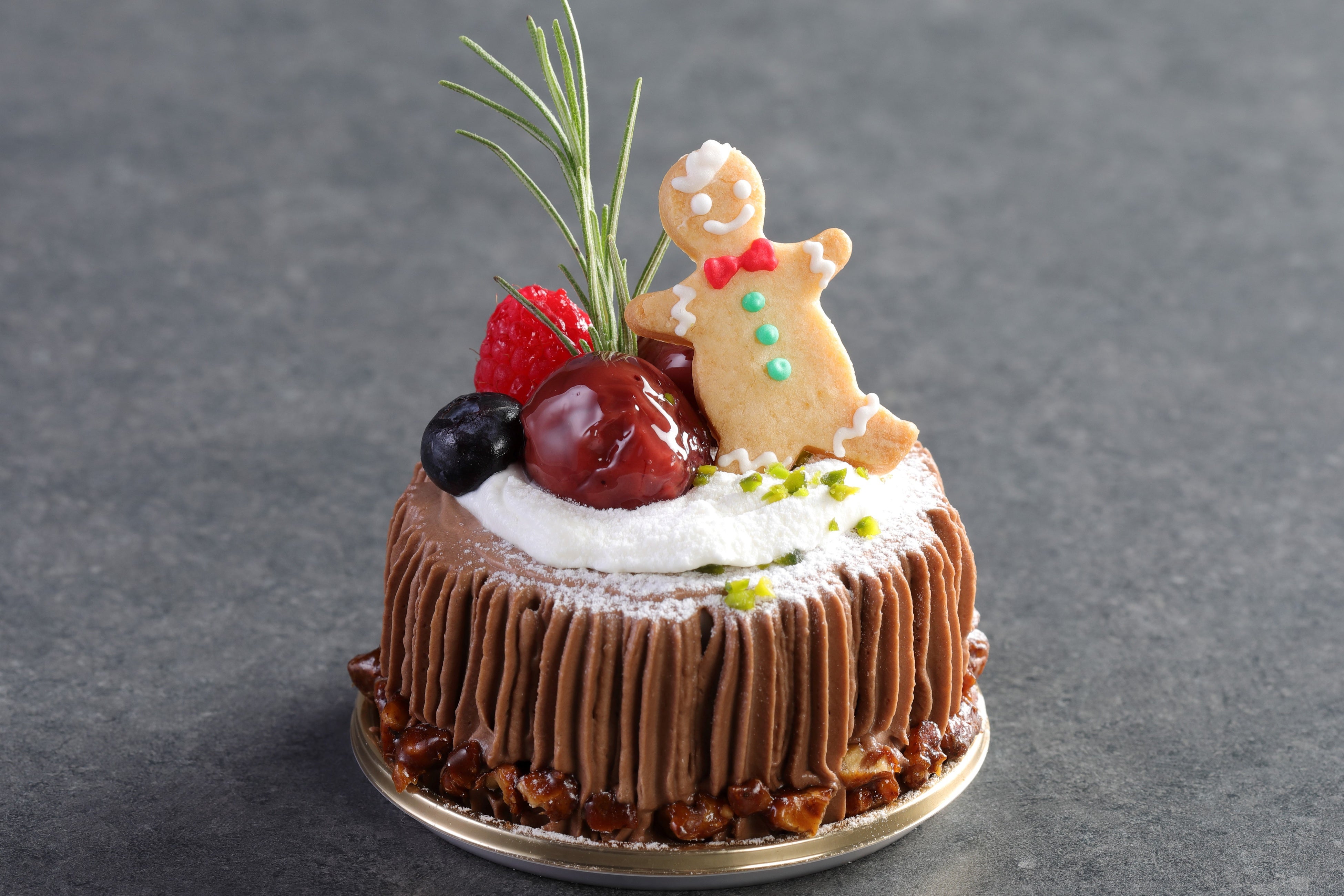 雪の中で遊ぶジンジャーブレッドマンを表現した、可愛らしいミニサイズのブッシュ・ド・ノエル。チョコレートクリーム、キルシュクリーム、チェリーのコンポートをチョコレートのスポンジケーキでサンドし、チョコレートクリームを切り株風に絞りました。