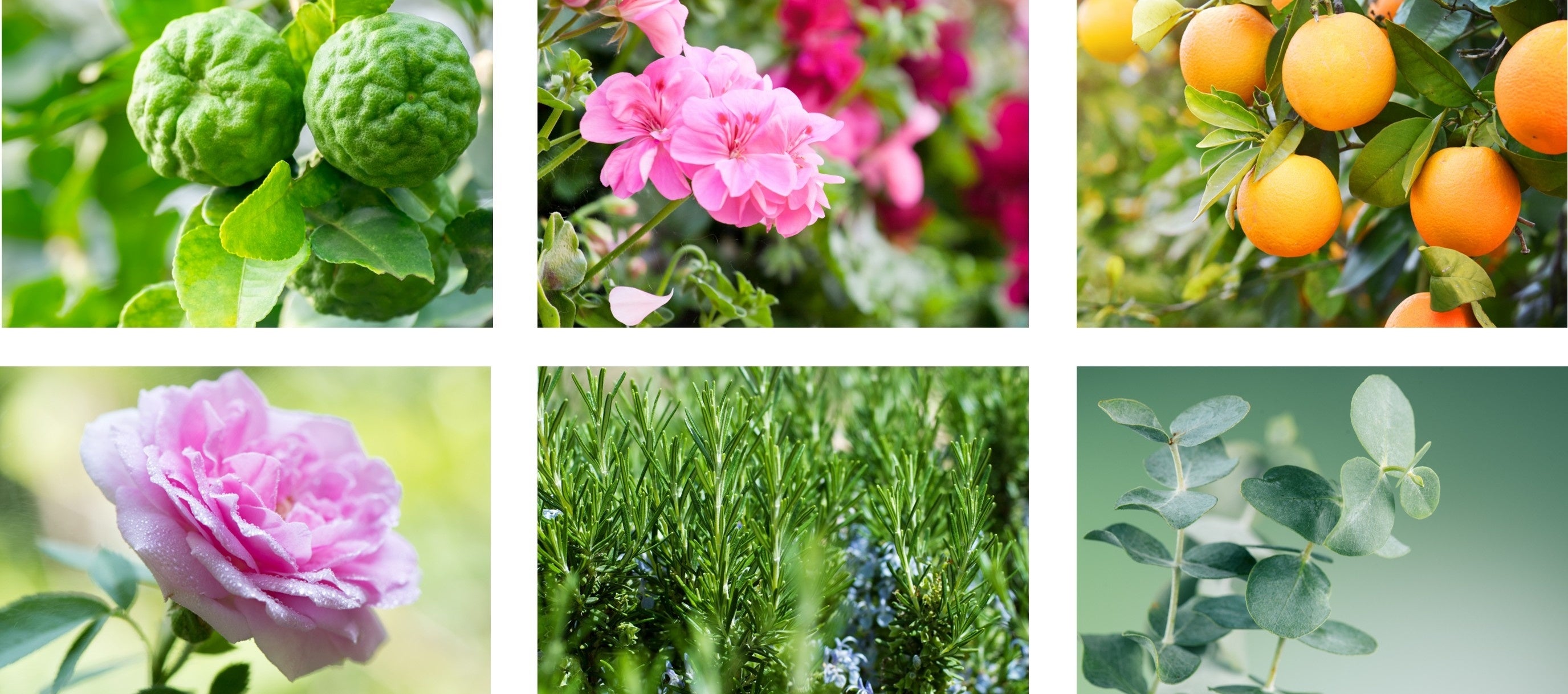 ベルガモット、ゼラニウム、オレンジ、ダマスクローズ、ローズマリー、ユーカリの天然精油を配合。
