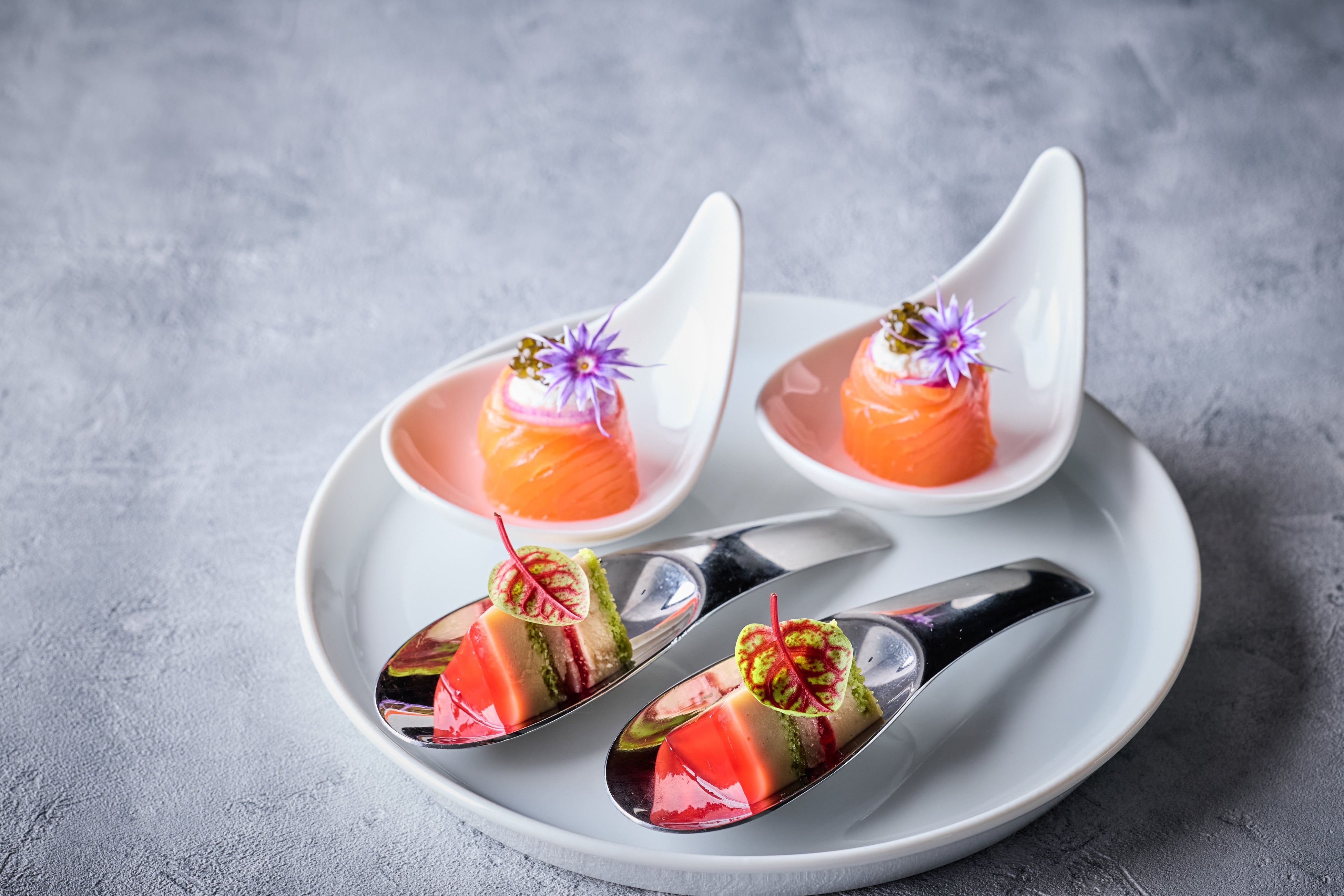 2段目:オシェトラキャビアとタスマニアサーモン/フォアグラとグリオットチェリーのミルフィーユ仕立て