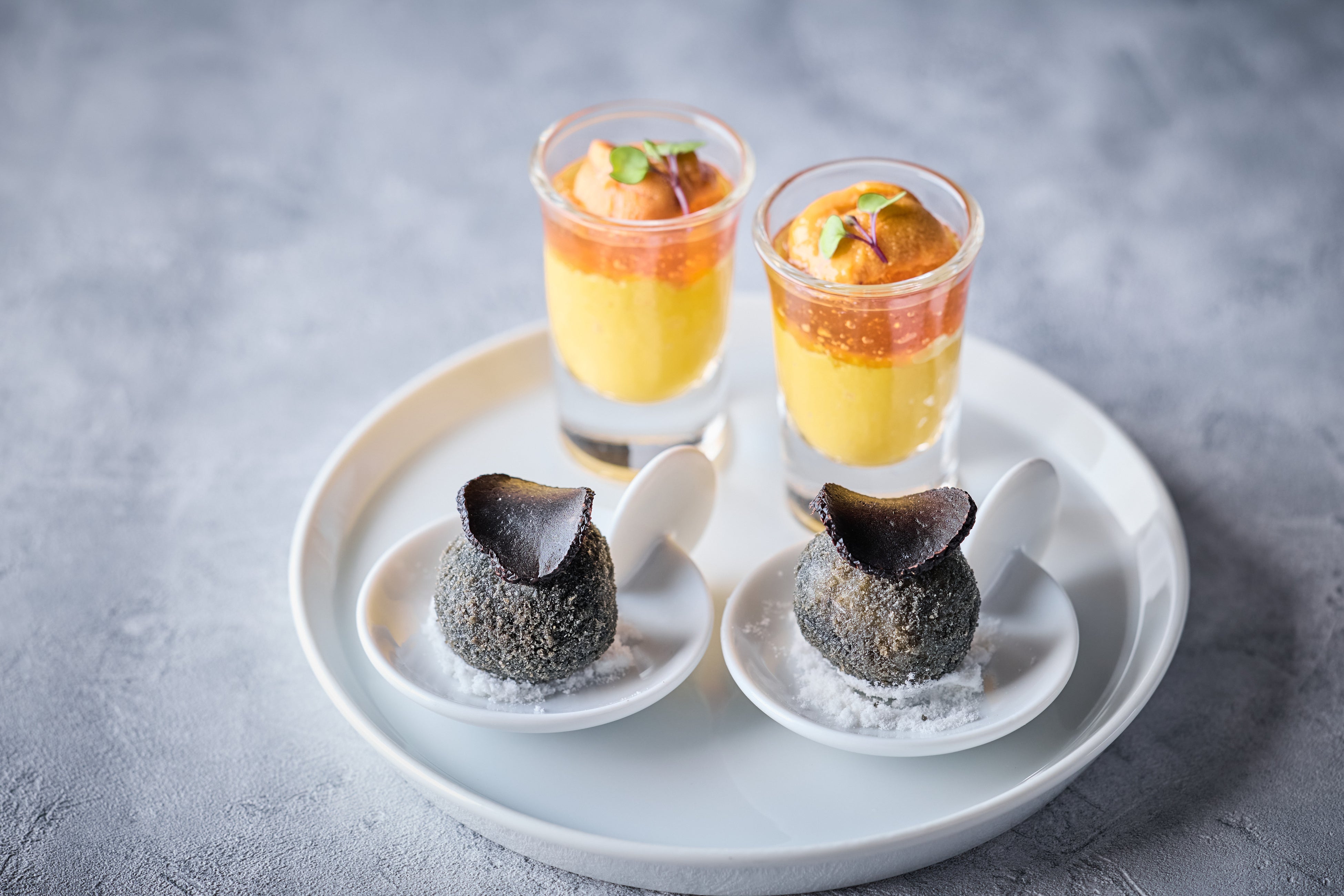 1段目:雲丹をのせた碧南人参のムースとコンソメジュレ/黒トリュフのリゾットクロケット