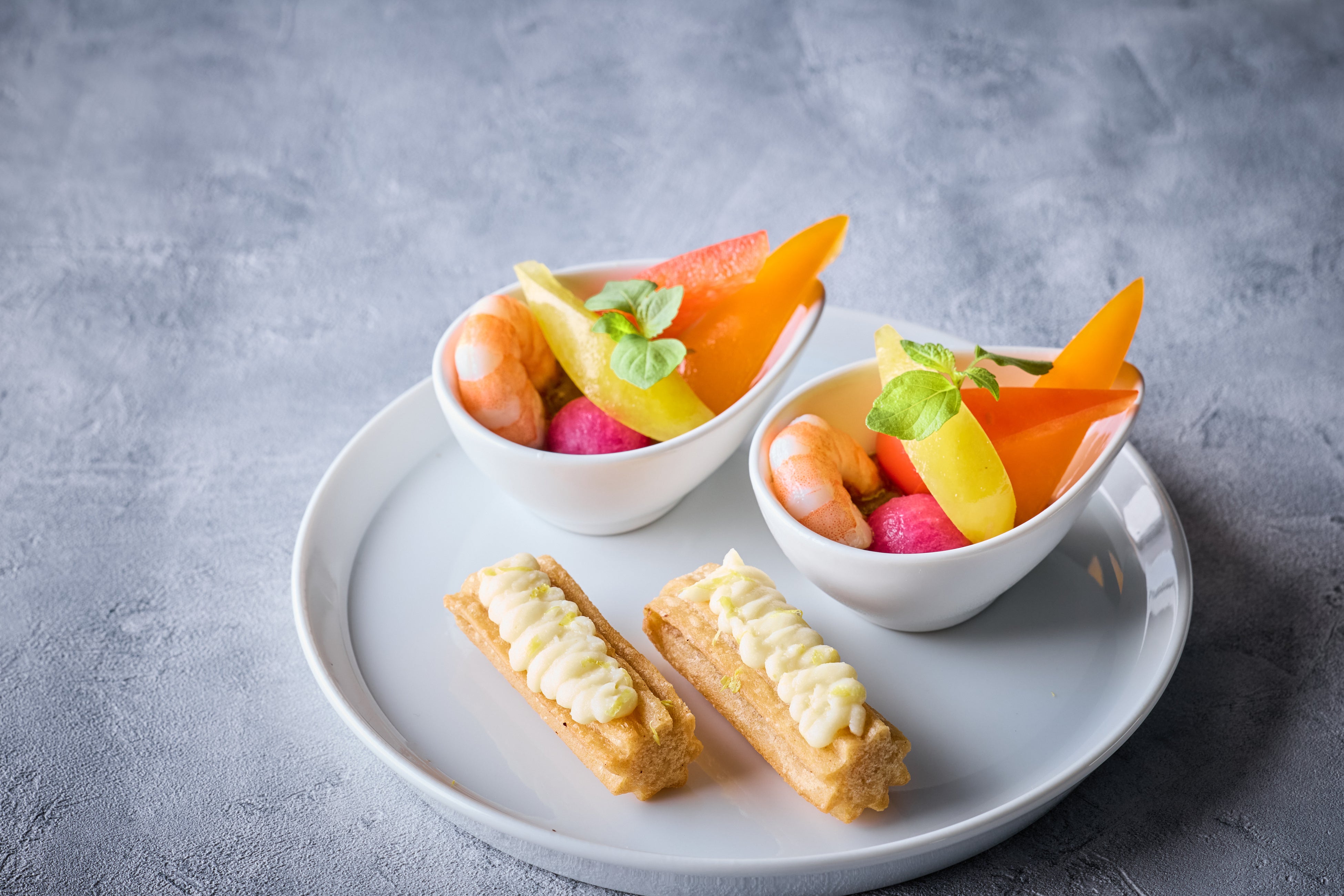 3段目:海老マリネとカラフルベジタブル ブラックオリーブのタプナードソース/プチチュロス 塩レモンクリーム
