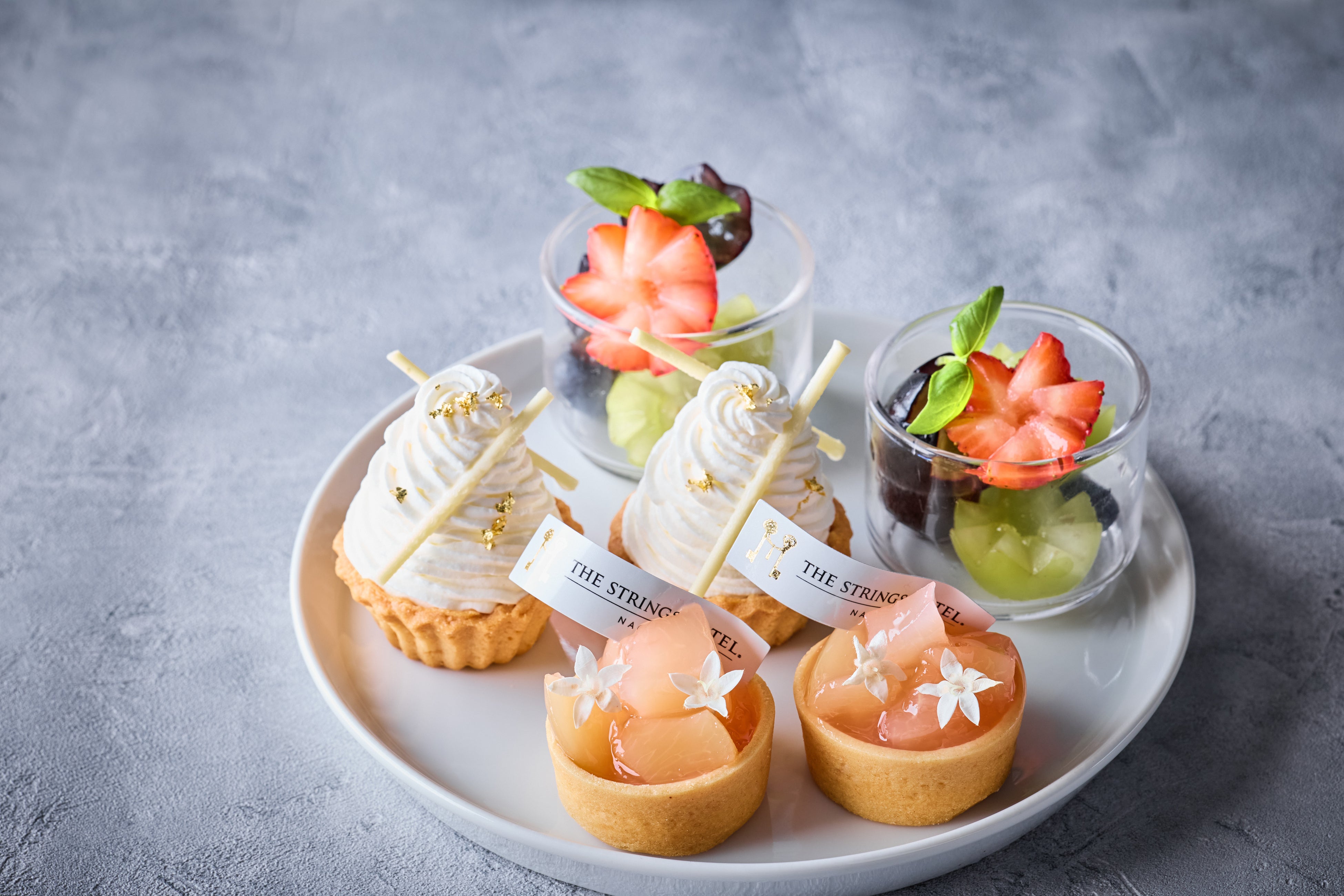 「STRINGS イブニングハイティー」のメニューは、5段スタンドに黒トリュフのリゾットを竹炭で黒く色づけたパン粉で揚げたクロケットや、ミルフィーユ仕立ての彩りが美しいフォアグラとグリオットチェリーのテリーヌ、風味の効いたセロリラブのムースをサーモンマリネでロールしオシェトラキャビアを添えた一品、甘みのある愛知県産の碧南人参のムースとコンソメジュレの層に贅沢に雲丹をのせたヴェリーヌ、濃厚なチーズが香るグラタン風クロワッサンサンドなど8種の特製セイボリーと、パティシエおススメの季節の2種のスイーツとフルーツ盛り合わせをご用意。メインの別皿のお料理は柔らかく濃厚な味わいの牛脛肉の赤ワイン煮込みを堪能いただけます。