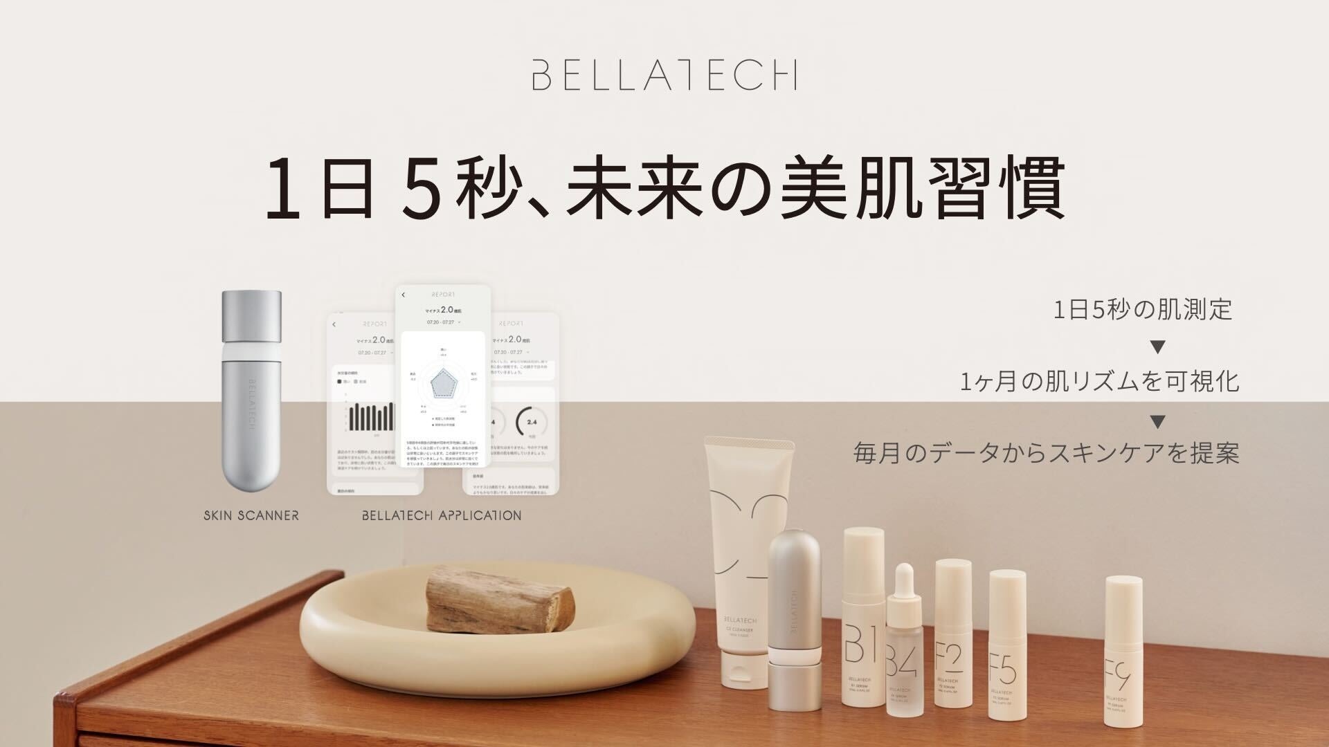 『BELLATECH』は、次世代の美肌習慣として「AI肌育」をテーマに自分で自分の肌を知ることから始まるスキンケアを提案するブランドです。 1日5秒で簡単に肌測定ができる、独自技術の「SKIN SCANNER」をメインプロダクトとし、その肌測定の結果に基づいたスキンケアアイテムを定期便でお届けするサブスクサービスを展開しています。