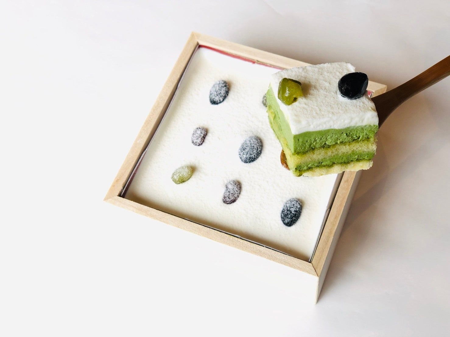 なめらかな口当たりに、豊かな抹茶の風味をお楽しみいただけます。新鮮な豆乳ムースに、若旦那こだわりの白餡と、フロマージュブラン、[柳桜園]の抹茶などこだわりの材料を一つ一つ手作業で合わせて作るお菓子です。