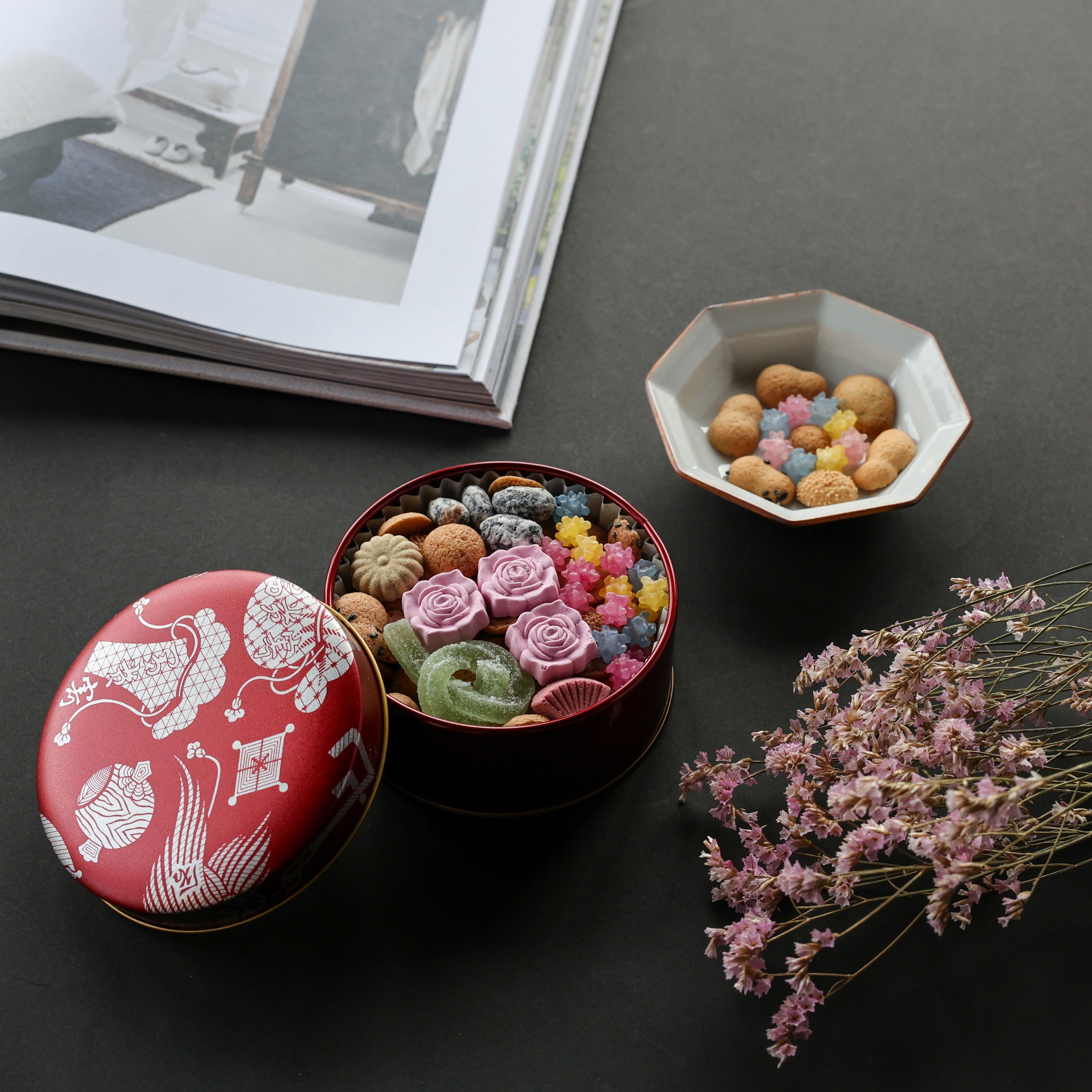 豆菓子やバターを使わない和風クッキー、金平糖などを、小さな丸缶におさめました。