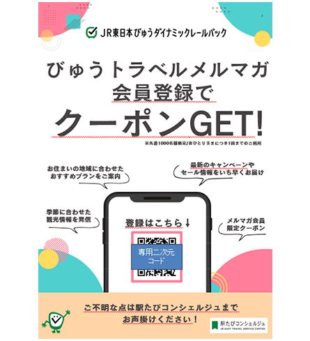 キャンペーン対象の駅たびコンシェルジュでびゅうトラベルメルマガに新規会員登録していただいた方に、JR東日本びゅうダイナミックレールパックの「5%OFFクーポン」と「10周年記念ノベルティ」をプレゼント!ノベルティの配布はなくなり次第終了となります。5%OFFクーポンは先着利用1,000名さまとなりますので、お申し込みはお早めに!
