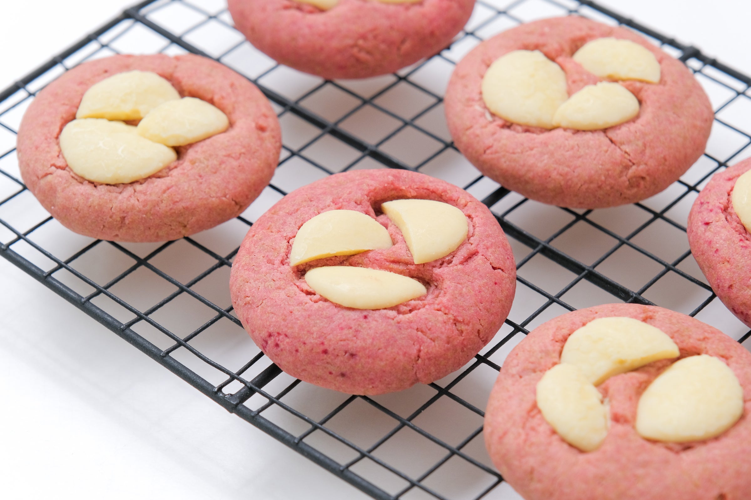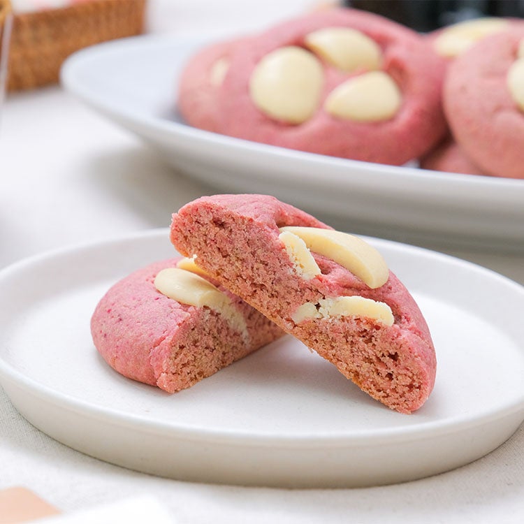 イチゴパウダーの自然な酸味とホワイトチョコのまろやかな甘さがとけあい、口いっぱいに広がります。ふんわり香るイチゴとミルキーな余韻が、心までやさしく包み込むアメリカンクッキーです。