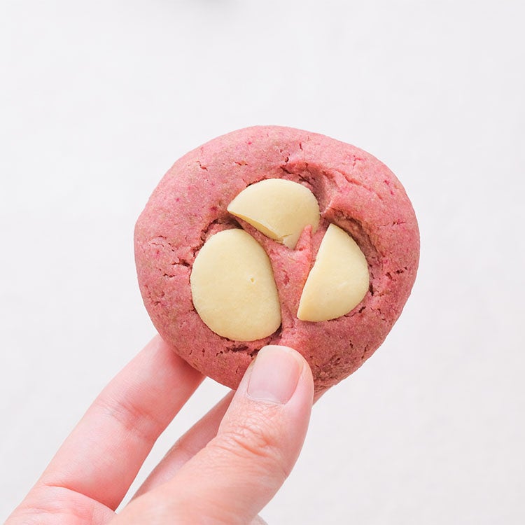 原材料:きび糖、薄力粉、強力粉、バター、卵、ホワイトチョコレート、脱脂粉乳、アーモンドプードル、イチゴパウダー、ビーツパウダー、塩 / 重曹