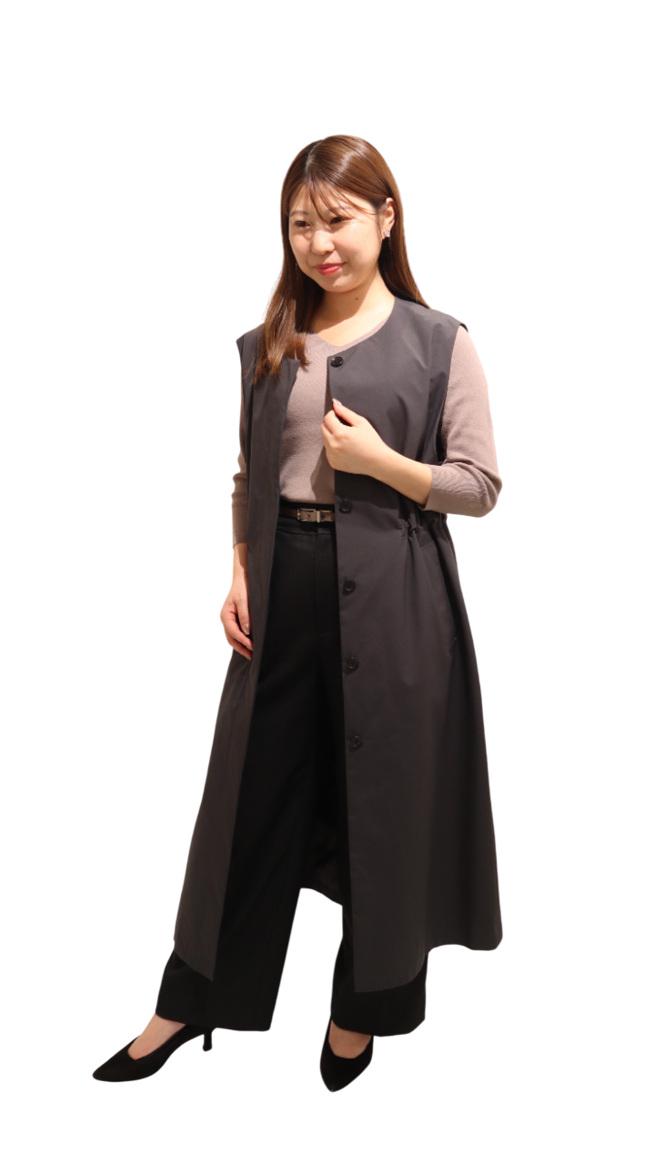 今回の企画は、営業店スタッフの声から生まれたコートです。相宗さんとともに普段、接客をする中でお客様からいただくリアルな声を参考にしながら、着丈の長さやボタンなど細部にまで拘って作成しました。市場にあるアウターとしてのジレは、極端に薄手なものか、厚手でカジュアル見えするものが多くビジネス使いが難しいです。今回は程よい肉感とハリのある素材を採用することで、きちんと感を演出するためオンオフで安心して着用できます。気温や気分に合わせて、さまざまな着こなしを楽しんでいただきたいです。