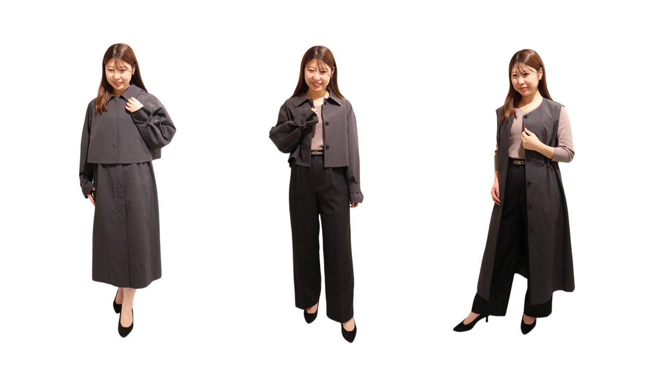 今回発売するアイテムは、トレンチコートとしてはもちろんのこと、シーンや気温に合わせてショートジャケット・ジレとしても着回しが可能です。ショートジャケットはウエストが見える程度の丈感にしているため、ボトムスとのバランスが取りやすく脚長効果が期待できます。ジレは程よい肉感のある生地に加えて、温かさを感じやすい背中部分に、保温機能のある中綿を使用することで、一枚でも快適に着用できます。それぞれ単品使いもしやすく、外出時やランチの際にも気軽に羽織れるほか、朝晩の寒暖差や気温の変化にも対応するため長期間で活躍するアイテムです。